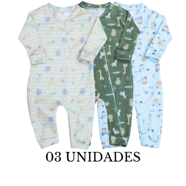 Combo Macacão Bebê Menino 03 Peças Soft Estampado com Zíper Macio Quente Kit Macacao Frio Pijama