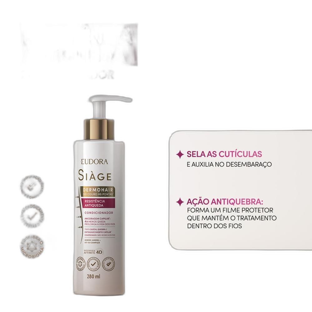 O Combo SIÀGE ANTIQUEDA Shampoo + Condicionador é a dupla feita para quem busca um tratamento para queda de cabelo. O Combo promove fios mais fortes, resistentes e com crescimento saudável. SHAMPOO O Shampoo Resistência Antiqueda Siàge Dermo Hair auxilia no tratamento completo para cabelos mais fortes, saudáveis e resistentes à queda. Sua fórmula com Minoxi-Amenil e Vit-10-Complex age diretamente na raiz do problema, promovendo uma ação multidimensional. Redução de até 4x na queda capilar70% menos quebra dos fiosCabelos mais resistentes, com preenchimento da fibra capilar e toque macio CONDICIONADOR O Condicionador Siàge Dermo Hair Resistência Antiqueda desembaraça os fios delicadamente e sela as cutículas, formando um filme protetor que mantém o tratamento dentro da fibra capilar, prolongando o efeito antiqueda. Sua fórmula inovadora, com Minoxi-Amenil e Vit-10-Complex, age diretamente na raiz do problema, fortalecendo os fios desde a raiz até as pontas. Aumenta em até 50% a resistência dos fiosReduz em até 70% a quebra dos fiosCabelos 3x mais macios Nenhum produto Eudora é testado em animais, ou seja, este item possui selo Cruelty Free. **** IMPORTANTE: Não vendemos para contas CNPJ, evite que seu pedido seja cancelado! ****