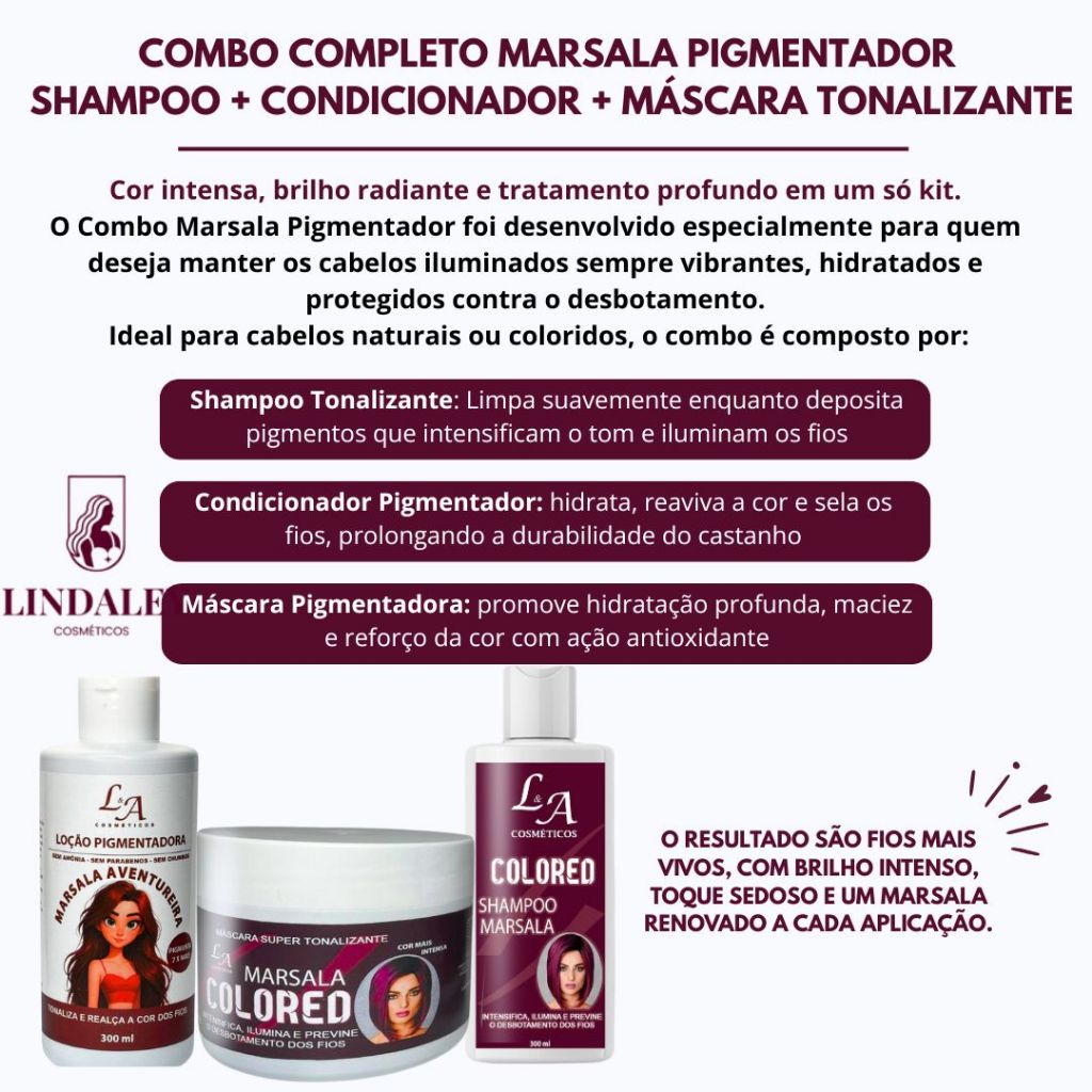 Combo Marsala Pigmentador – Shampoo + Condicionador + Máscara Tonalizante ✨ Cor vibrante, brilho espelhado e tratamento profundo em um só kit! O Combo Marsala Pigmentador é a escolha perfeita para quem deseja manter os cabelos com o tom marsala intenso e iluminado, ao mesmo tempo em que trata os fios com hidratação profunda e proteção contra o desbotamento. Indicado para cabelos naturais ou coloridos, o combo proporciona um efeito de morena iluminada marsala, com brilho radiante e cor duradoura. 💜 O kit contém: ✔ Shampoo Tonalizante Marsala: limpa suavemente e deposita pigmentos que intensificam a cor, deixando os fios mais vivos desde a primeira lavagem. ✔ Condicionador Pigmentador Marsala: hidrata, reaviva o tom e sela os fios, prolongando o efeito da cor e combatendo o ressecamento. ✔ Máscara Pigmentadora Marsala: promove hidratação intensa, toque sedoso e reforço da cor com ação antioxidante. Sem amônia. 💡 Ideal para: Reavivar a cor de cabelos marsala desbotados Realçar o tom de cabelos castanhos ou vermelhos Manutenção de cor entre colorações Tratamento completo com pigmentação + nutrição 🌟 Resultado: cabelos com tom marsala renovado, brilho intenso, cor uniforme e fios saudáveis da raiz às pontas.