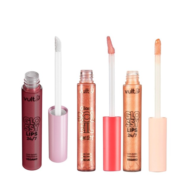 Combo Vult Gloss Labial: Bronze Glossy Lips 5,2ml + Pérola Cintilante Glossy Lips 5,2ml + Praiana Soleil Sunset 5,2ml