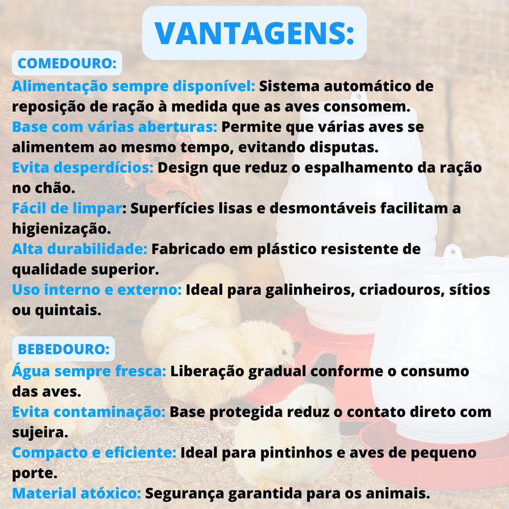 ITENS DO ANÚNCIO: Comedouro para Aves Galinheiro 12 furos 3,5L Vermelho Bebedouro para Aves Galinheiro 2 L Vermelho ESCOLHER VARIAÇÃO DA QUANTIDADE/ITENS DESEJADOS Garanta mais saúde, economia e praticidade na criação das suas aves com este Kit Comedouro 3,5 Kg e Bebedouro 2 L completo! Ideal para quem busca eficiência e bem-estar animal, o Comedouro e o Bebedouro são projetados com sistema antidesperdício, o que evita sujeira, contaminação e perda alimento. Seja para galinhas, frangos, pintinhos, patos, codornas ou outras aves, este bebedouro se adapta com facilidade a diferentes espécies, promovendo uma alimentação contínua, limpa e segura. Benefícios que fazem a diferença: Sistema antidesperdício: evita que as aves espalhem comida ou água Versatilidade: ideal para diferentes tipos e tamanhos de aves Sistema com rosca: fácil de montar, desmontar e limpar Durabilidade: feito com plástico resistente e de qualidade Prato amplo e estável: evita tombamentos e desperdícios. Higiene garantida: fácil de desmontar e higienizar, promove uma alimentação mais saudável Uso interno e externo: Ideal para galinheiros, criadouros, sítios ou quintais. (pendurado ou no chão) É a escolha ideal para quem valoriza o cuidado com os animais, o controle de custos e a eficiência no manejo diário para pequenas e grandes criações. FICHA TÉCNICA: Capacidade do comedouro (12 furos): 3,5 Kg Capacidade do bebedouro: 2 L Medidas do comedouro: 30 cm altura x 25 cm largura (prato) Medidas do bebedouro: 20 cm altura x 18 cm largura (prato) Material: Plástico resistente de alta qualidade Cor: Branco transparente com base vermelha Espécies indicadas: Galinhas, frangos, pintinhos, patos, codornas e aves similares Montagem: Sistema de rosca com prato acoplado Uso: Criações domésticas, rurais e comerciais Instalação: Pode ser apoiado no chão ou suspenso Limpeza: Fácil desmontagem para higienização completa Por que escolher nossos alimentadores em vez de outros do mercado? Diferente de modelos comuns que desperdiçam alimento com facilidade, nosso comedouro conta com sistema inteligente de contenção que evita respingos, sujeira e contaminação. Enquanto muitos comedouros usam plásticos frágeis que quebram em pouco tempo, o nosso é feito com material resistente e duradouro, ideal para o uso contínuo no dia a dia da criação. Além disso, a montagem com rosca garante mais segurança, estabilidade e praticidade na hora de reabastecer ou limpar.
