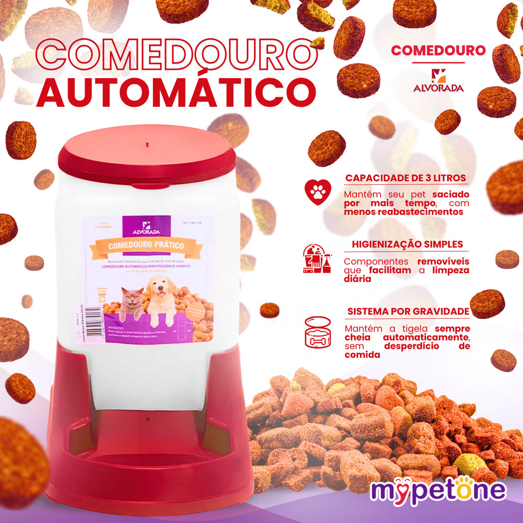 Comedouro Prático Alvorada Pet 3 Litros Mais praticidade e higiene para a alimentação do seu pet com o Comedouro Prático Alvorada Pet 3 Litros. Ideal para cães e gatos de todos os portes, ele possui capacidade generosa e estrutura resistente, garantindo refeições sempre organizadas e acessíveis para o seu animal de estimação. Seu sistema de alimentação por gravidade permite que o compartimento inferior esteja sempre abastecido com ração, oferecendo autonomia e conforto mesmo quando você estiver fora por algumas horas. Por que escolher o Comedouro Alvorada 3 Litros: - Capacidade de 3 Litros: Armazena uma boa quantidade de ração seca, reduzindo a frequência de reabastecimento - Sistema por Gravidade: Mantém o recipiente sempre cheio conforme o pet consome a ração - Base Estável e Antiderrapante: Mais segurança na hora da alimentação - Fácil de Higienizar: Peças removíveis que facilitam a limpeza do dia a dia - Transparente e Funcional: Permite visualizar facilmente o nível de ração disponível Especificações Técnicas: - Capacidade: 3 Litros - Cores: Azul, Rosa, Preto, Vermelho Dimensões Aproximadas: - Altura: 22,5 cm - Base: 27 cm Material: - Reservatório em plástico translúcido de alta resistência - Base em polipropileno atóxico e livre de BPA Com o Comedouro Prático Alvorada pet 3L, você garante uma rotina mais prática e saudável para seu pet, com alimentação contínua e organizada.