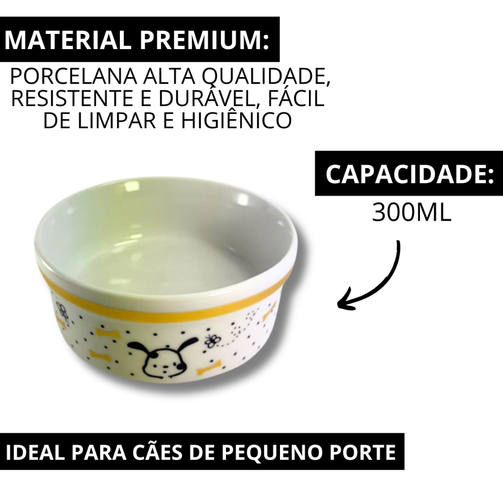 O COMEDOURO IDEAL PARA O SEU MELHOR AMIGO CHEGOU! Comedouro Bebedouro 300ml de Porcelana - 2 Peças - Estilo e Conforto para o Seu Pet. Beleza, qualidade e fofura em um só produto! Nosso comedouro/bebedouro de porcelana de 300ml é perfeito para tornar a alimentação do seu pet ainda mais especial. Com um design encantador cheio de ossinhos, borboletinhas e cachorrinhos, além de uma faixa dourada que dá um charme único, ele vai deixar qualquer cantinho da sua casa ainda mais bonito! CARACTERÍSTICAS: - Material de porcelana de alta qualidade: Higiênico, fácil de limpar e resistente. - Capacidade de 300ml: Ideal para cães de pequeno porte. - Estampa exclusiva: Com ossos, borboletas e cachorrinhos - Design elegante e atemporal: Perfeito para combinar com qualquer estilo de decoração. - Mantém a temperatura: Conserva a água fresca por mais tempo. - Acabamento brilhante e elegante com detalhes dourados. - Fácil de higienizar: Não retém odores e evita proliferação de bactérias. - Produto durável, feito para acompanhar seu pet por muito tempo. -ESPECIFICAÇÕES TÉCNICAS - Diâmetro: 12,5cm. - Altura: 5cm. - Capacidade: 300 ml. - Material: Porcelana. -SAÚDE E HIGIENE: A porcelana não retém odores nem bactérias, proporcionando um ambiente mais saudável para as refeições do seu pet. Durabilidade: Resistente e duradouro, o comedouro de porcelana é um investimento que vale a pena. Estilo e Funcionalidade: Combina funcionalidade e beleza, harmonizando com qualquer decoração de ambiente. Seu pet merece o melhor! Garanta já o seu e traga mais conforto e sofisticação para o dia a dia dele! ALTA QUALIDADE DENTRO DO MERCADO. Envio em 12h úteis | Embalagem extremamente segura.