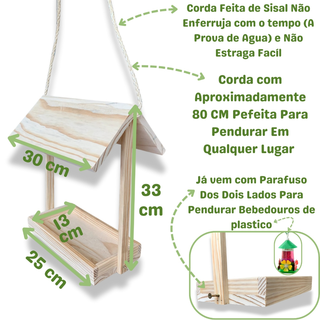 Descrição do Produto: O Tratador Aberto Silvestre de Madeira Pinus é um comedouro 2 em 1 que combina casinha e alimentador para aves. Feito em madeira Pinus de alta qualidade, ele é ideal para quem quer atrair e alimentar aves silvestres de forma prática e sustentável. Seu design aberto garante ventilação e facilidade na limpeza, enquanto o material durável e rústico harmoniza perfeitamente com qualquer ambiente externo, como jardins, varandas e viveiros. Vantagens: Praticidade e Versatilidade: Comedouro e abrigo em uma só peça, perfeito para atrair aves ao ambiente externo. Madeira Sustentável: Confeccionado com madeira Pinus de fontes sustentáveis, respeitando o meio ambiente. Design Funcional e Charmoso: Ideal para áreas externas, em jardins, varandas e viveiros. Benefícios: Atrai Diversas Espécies: Proporciona um ponto seguro de alimentação para diversas aves. Contribui para o Bem-Estar das Aves: Oferece um local natural e seguro para descanso e alimentação. Decoração Atraente: Adiciona beleza e funcionalidade ao seu espaço externo. Medidas: -Casinha de Pendurar: Comprimento: 35 cm Largura: 23 cm Altura: 28 cm -Casinha de Chão: Comprimento: 30 cm Largura: 13 cm Altura: 137 cm Saudação: Invista no Comedouro e Casinha para Pássaros em Madeira Pinus e transforme seu ambiente em um santuário de aves. Boas compras!