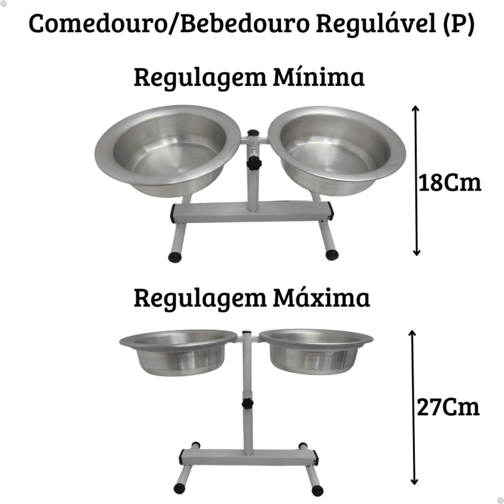 -O seu cão empurra o comedouro de um lado para o outro toda vez que se alimenta? Acabe com este problema de forma simples! -Muitas vezes os cães são tão enérgicos e alegres que acabam empurrando comedouros leves para todos os lados, ás vezes até virando o comedouro de ponta cabeça e esparramando a ração por todo o chão... É uma situação desconfortável tanto para o cão quanto para o dono(a), não é mesmo? -Além disso, você sabia que a alimentação ideal dos cães deve ser na altura do peito? Alguns cães podem ter problemas no megaesôfago ao se alimentarem continuamente com comedouros no chão. -O Comedouro Duplo Regulável de Alumínio para Cães é a solução mais simples e utilizada por donos(a) de cães para acabar com estes problemas! Você pode regular e ajustar a altura de acordo com o porte do seu amigo ao mesmo tempo que proporciona um comedouro e um bebedouro para o cão! -Benefícios do Comedouro Duplo Regulável de Alumínio Premium para Cães: -Duplo: Comedouro + Bebedouro. -Mais higiênico. -Altura ideal para alimentação de cães com problema no esôfago. -Menor contato com sujeiras, pelos e pó que comedouros do chão. -Antioxidante. -Mais confortável para alimentação de cães independente do porte. -Fácil de limpar. -Utilizável tanto para rações quanto água. -Linha Premium -Embalado direto de fábrica -Informações Técnicas: -Produto: Comedouro Duplo Regulável de Alumínio para Cães Premium. -Tipo: Comedouro e Bebedouro. -Animal: Cachorro e Gatos. -Porte: Pequeno Médio Grande e Gigante. -Itens Inclusos: 1 Comedouro Duplo Regulável de Alumínio para Cães Premium Completo (Comedouro + Bebedouro + Armação). -Material: Alumínio. Medidas: -Comedouro Regulável (G) -Litragem: 2,500 ML. -Regulagem Máxima: 42 Cm -Regulagem mínima: 28 Cm -Parte de aço (Armação): 24 Cm Largura. 39 Cm Comprimento. Comedouros alumínio: 25 Cm. ----------------------------------------------------------------------------------------------------------------------------- -Comedouro Regulável (M) -Litragem: 1,500 ML. -Regulagem Máxima: 35 Cm -Regulagem mínima: 23 Cm -Parte de aço (Armação): 20 Cm Largura. 34 Cm Comprimento. -Comedouros alumínio: 21 Cm. ----------------------------------------------------------------------------------------------------------------------------- -Comedouro Regulável (P) -Litragem: 1Litro. -Regulagem Máxima: 27Cm -Regulagem mínima: 18Cm -Parte de aço (Armação): 18Cm Largura. 27Cm Comprimento. -Comedouros alumínio: 19 Cm. ------------------------------------------------------------------------------------------------------------------------------ -Comedouro Regulável (Mini) -Tipo: Comedouro e Bebedouro. -Animal: Cachorros e Gatos Filhotes. -Porte: Pequeno. -Regulagem Máxima: 20Cm -Regulagem mínima: 14Cm -Parte de aço (Armação): 13Cm Largura. 23Cm Comprimento. -Volume: Mini - 300 ML -Material: Alumínio. ----------------------------------------------------------------------------------------------------------------------------- PERGUNTAS FREQUENTES POSSUI OUTROS TAMANHOS? Não! Apenas os tamanhos Mini, P, M e G, os quais contemplam todas as raças e portes. -Equipe O Plano Pet -Produtos 100% Original e de Qualidade! -Emitimos Nota Fiscal. -24 Horas Disponível Para Duvidas. RECOMENDAÇÕES DE TAMANHO PELO PORTE DO CÃO Porte do Cão: Mini, Pequeno, Médio e Grande Porte.