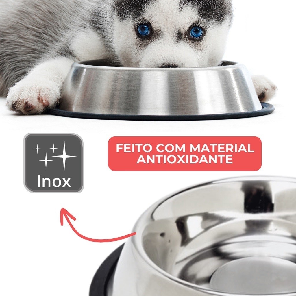 **Comedouro e Bebedouro Inox Antiderrapante para Cães e Gatos - Resistente e Fácil de Limpar** **Produto Importado, Estoque no Brasil, Envio Imediato!** Feito em inox antioxidante e com borracha antiderrapante, o **Comedouro e Bebedouro Inox** é a solução perfeita para evitar que seu pet empurre o recipiente enquanto se alimenta. Disponível em 4 tamanhos, ideal para cães e gatos de diferentes portes, garante conforto e praticidade tanto para o seu pet quanto para você. **Tamanhos Disponíveis:** - **P** - 150ml (15cm diâmetro x 4,5cm altura) – Ideal para gatos ou cães pequenos - **M** - 250ml (18cm diâmetro x 5,5cm altura) – Para cães pequenos - **G** - 500ml (22cm diâmetro x 6cm altura) – Para cães de porte médio - **GG** - 900ml (26cm diâmetro x 6cm altura) – Para cães grandes **Benefícios:** - **Borracha Antiderrapante:** Impede que o comedouro se mova ou vire enquanto o pet se alimenta, evitando sujeira e desperdício. - **Inox Antioxidante:** Material resistente e durável, mais higiênico e fácil de limpar. - **Versatilidade:** Pode ser usado para água ou ração. - **Água Fresca:** Mantém a água fresca por mais tempo, ideal para hidratação contínua. **Perguntas Frequentes:** - **Posso usar para gatos?** Sim! Recomendamos o tamanho **P** para gatos, ideal para suas necessidades. Escolha o tamanho que melhor se adapta ao seu pet e ofereça uma alimentação mais tranquila e sem bagunça! Com o **Comedouro e Bebedouro Inox Antiderrapante**, seu pet vai se alimentar com mais conforto e praticidade, enquanto você economiza tempo com a limpeza fácil e rápida.