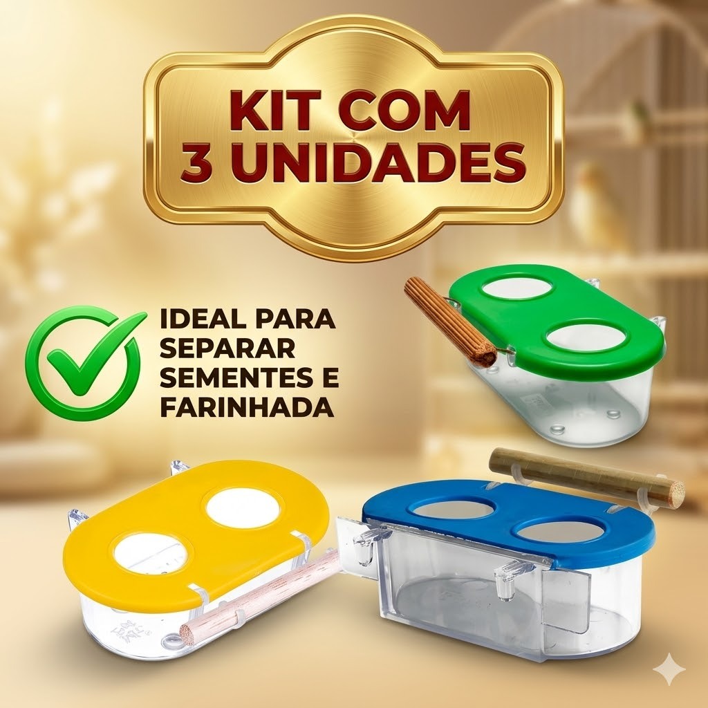 KIT ANTI-DESPERDÍCIO PREMIUM: 3 COMEDOUROS 2 FUROS COM POLEIRO DE MADEIRA (130ML) — O FIM DA SUJEIRA E O MÁXIMO CONFORTO PARA SUAS AVES! Você está cansado de varrer cascas e sementes inteiras do chão da sua sala todos os dias? Aves têm o instinto de ciscar e balançar a cabeça para escolher os grãos favoritos, jogando grande parte da ração cara literalmente no lixo! A solução definitiva para esse prejuízo é o Comedouro Anti-Desperdício Premium com 2 Furos. Além de bloquear a bagunça, ele vem equipado com um poleiro de madeira natural, proporcionando a posição anatômica perfeita para a sua ave se alimentar sem estresse. Com este Kit de 3 unidades, você revoluciona a higiene e a organização da sua gaiola! POR QUE ESCOLHER ESTE PRODUTO Desenvolvido com uma base em acrílico 100% transparente, ele permite que você monitore o nível de alimento de longe. A tampa colorida possui dois orifícios calculados para que a ave acesse a comida com facilidade, mas não consiga espalhá-la para fora. Os robustos ganchos de fixação traseiros garantem um encaixe perfeito e seguro na maioria das gaiolas do mercado. BENEFÍCIOS PRINCIPAIS - SISTEMA ANTI-DESPERDÍCIO: A tampa bloqueadora de 2 furos impede que as aves joguem sementes, ração extrusada ou farinhada para fora do pote. - CONFORTO ERGONÔMICO (POLEIRO): O poleiro frontal em madeira imita a natureza, permitindo que a ave pouse confortavelmente para comer, auxiliando também no desgaste natural das unhas. - VISUALIZAÇÃO TOTAL (130ML): Base transparente que facilita o controle de sementes e cascas vazias sem precisar abrir a gaiola. - FÁCIL INSTALAÇÃO E LIMPEZA: Os ganchos acoplados oferecem fixação rápida na grade. A tampa superior é removível para facilitar a higienização diária. - CORES ALEGRES: O kit conta com tampas em cores vivas (Amarelo, Verde, Azul) que estimulam o apetite da ave e deixam o ambiente mais bonito. APLICAÇÕES E MODO DE USO Ideal para Canário Belga, Coleiro, Curió, Calopsita, Periquito, Agapornis, Manon, Diamante Gould e outras aves de pequeno a médio porte. Instalação: Encaixe os ganchos traseiros na grade da gaiola (do lado de dentro ou na portinha externa guilhotina), mantendo o poleiro voltado para o interior. ESPECIFICAÇÕES TÉCNICAS Modelo: Comedouro 2 Furos com Gancho e Poleiro Capacidade: 130 ml Material da Base: Acrílico / Plástico Transparente Material da Tampa: Plástico Colorido Atóxico Material do Poleiro: Madeira Natural Quantidade: Kit contendo 3 unidades completas. FAQ — DÚVIDAS FREQUENTES A cabeça da calopsita passa no furo? Sim, o diâmetro dos orifícios foi projetado para permitir que aves desde o porte de um coleiro até o de uma calopsita se alimentem confortavelmente. Posso escolher as cores das tampas? O kit é montado com cores sortidas e vibrantes de fábrica para enriquecer visualmente a gaiola do seu pet. A madeira do poleiro pode ser lavada? Sim, pode ser lavada com água corrente e sabão neutro. Recomendamos apenas que deixe secar bem ao sol antes de retornar para a gaiola para evitar umidade. PARE DE JOGAR SEMENTES CARAS NO LIXO! GARANTA O SEU KIT COM 3 COMEDOUROS ANTI-DESPERDÍCIO AGORA MESMO!