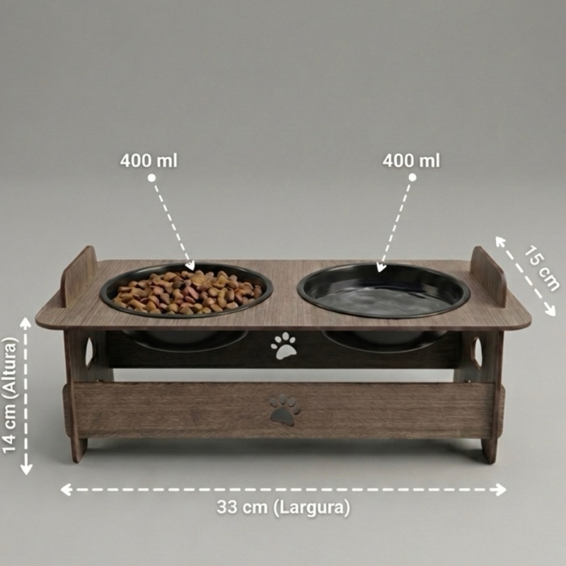 Comedouro e Bebedouro Elevado Ergonômico Premium MEDIDAS E MATERIAL • Material: Madeira MDF Premium com tratamento de proteção. • Altura: 14 cm (ideal para postura correta de cães e gatos). • Largura: 36 cm. • Comprimento: 17 cm. • Tigelas: 2 unidades de 400 ml cada • Peso aproximado: 950 g. ⚠️ ATENÇÃO: Produto ergonômico que previne doenças na coluna e refluxo! Estoque com envio imediato e garantia de satisfação. Meça a altura do peito do seu pet para garantir o máximo conforto com este suporte de 14 cm. O Comedouro e Bebedouro Elevado de 14 cm de altura é o investimento ideal para a saúde do seu pet. Ao elevar as tigelas, você permite que seu cão ou gato se alimente com a coluna alinhada, evitando tensões musculares e facilitando a deglutição, o que reduz drasticamente episódios de engasgos e vômitos após a refeição. Fabricado em MDF Premium de alta densidade e acabamento refinado, este conjunto une durabilidade e estética para sua casa. As tigelas de 400 ml DESTAQUE DO PRODUTO: • Capacidade Ideal: Duas tigelas de 400 ml que atendem perfeitamente as necessidades diárias de água e ração. • Postura Saudável: Altura de 14 cm que preserva as articulações do pescoço e coluna do animal. • Digestão Eficiente: O pet engole o alimento de forma natural, prevenindo o refluxo gastroesofágico. • Material Premium: Madeira com acabamento superior que não balança e oferece estabilidade total. • Fácil Higienização: Tigelas removíveis que facilitam a limpeza diária e garantem água sempre fresca. DADOS TÉCNICOS EM TÓPICOS: • Altura do suporte: 14 cm • Largura total: 36 cm • Comprimento: 17 cm • Capacidade por tigela: 400 ml • Material do suporte: MDF Premium comedouro pet, bebedouro gato, comedouro elevado, tigela 400ml, suporte madeira mdf, comedouro ergonomico, potinho de comida gato, vasilha cachorro, kit comedouro duplo, saude pet, acessorios para gatos, acessorios para caes, comedouro de luxo, porta ração, bebedouro ergonômico, tigela para gato, comedouro mdf 14cm, potinho de agua pet, bem estar animal, comedouro alto.