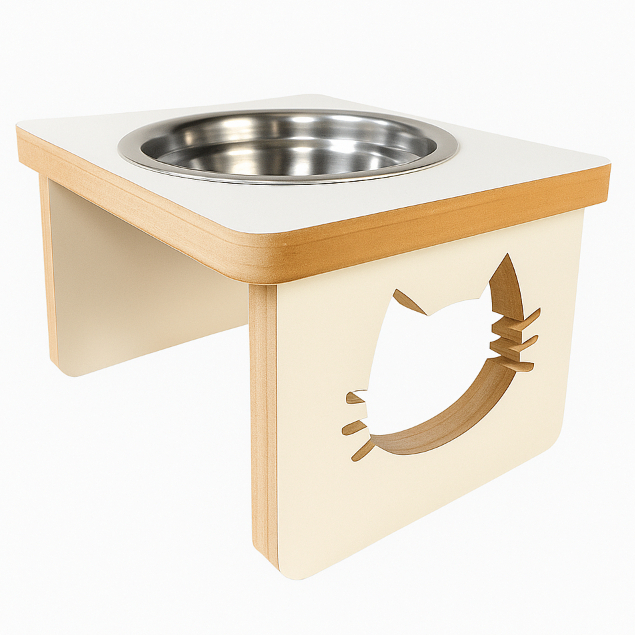 Comedouro PET Unitário MDF para GATOS INDICAÇÃO : GATOS (medida média) Adultos, Filhotes, Idosos, pequenos Cor: Branco Composição Madeira MDF , Inox. Dimensões Aproximada Altura: 12 cm Largura: 15 cm Comprimento: 19 cm Capacidade: cada tigela 330ml Fabricado em aço inox. Acompanha 1 Tigelas de Inox