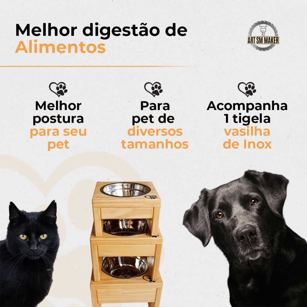 Comedouro Único Pet Elevado Ergonômico No Verniz para Cachorro e Gato Bicho de Estimação ✅Sobre o produto: ✔ Madeira pinus envernizado (atóxico) ✔ Tinta PVA é a base de água ✅Escolha na Variação: ✔ Pequeno ✔ Médio ✔ Grande ✔ 20CM-ALTURA ✅Diferencial do nosso produto: ✔ Ótima qualidade ✔ Alta durabilidade ✔ Envio super rápido ✔ Recomendado para gatos e cachorros de porte médio, proporciona uma melhor qualidade de vida e conforto para seu pet, além de combinar com qualquer decoração ✔ Produzido com madeira maciça de reflorestamento ele tem acabamento em verniz à base de água, o que além de mais sustentável ele não deixa aquele cheiro forte. Acompanha vasilha de inox ✅Benefícios: ✔ Melhora na digestão ✔ Cria uma postura mais saudável para seu pet ✔ Tem mais estabilidade na hora de se alimentar ✔ Higiene, o pet não fica derrubando água ou alimentos fora dos potes ✔ Comedouro entalhado na madeira, com ótimo acabamento e qualidade ✔ Pets com artrite comem com muitos mais conforto e menos dores ✔ Preserva articulações dos pets evitando esforço sobre elas ✔ Melhor absorção de oxigênio ✅Tabela de medidas: ✔ Medidas do pequeno: ✔ Altura: 10cm ✔ Largura: 17cm ✔ Comprimento: 17cm ✔ 01 Vasilhas de Inox: 400 ml ✔ Diâmetro das vasilhas: 13,5cm ✔ Medidas do médio: ✔ Altura: 15cm ✔ Largura: 20cm ✔ Comprimento: 20cm ✔ 01 Vasilhas de Inox: 800 ml ✔ Diâmetro das vasilhas: 18cm ✔ Medidas do intermediário: ✔ Altura: 20cm ✔ Largura: 20cm ✔ Comprimento: 20cm ✔ 01 Vasilhas de Inox: 800 ml ✔ Diâmetro das vasilhas: 18cm ✔ Medidas do grande: ✔ Altura: 30cm ✔ Largura: 25cm ✔ Comprimento: 25cm ✔ 01 Vasilhas de Inox: 1,5L ✔ Diâmetro das vasilhas: 21cm 🚚 Envio Super Rápido 🥰 Para dúvidas, estamos à disposição no chat