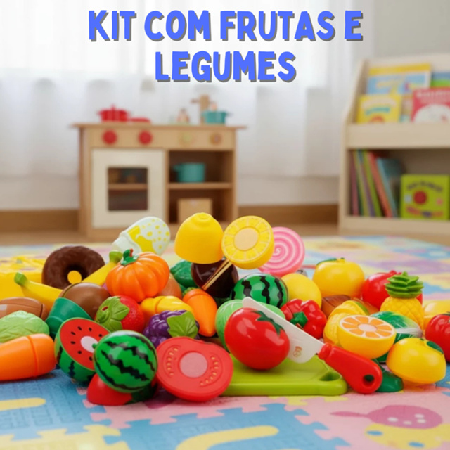 Brinquedo para criança acima de 3 anos. DESCRIÇÃO: O kit de comidinhas infantil é um irresistível convite ao mundo da imaginação e aprendizado para os pequenos em idade pré-escolar. Com uma variedade de frutas e guloseimas vibrantes e realistas, este conjunto é muito mais do que apenas um brinquedo, é uma ferramenta educativa que estimula habilidades cognitivas e motoras de maneira divertida e envolvente. As frutas são equipadas com velcro, possibilitando que as crianças pratiquem habilidades de coordenação motora fina ao cortá-las e juntá-las novamente, uma atividade que desperta a curiosidade e promove o desenvolvimento sensorial. Além da diversão proporcionada pelo ato de "cortar" e "preparar" as frutas, este kit oferece oportunidades valiosas de aprendizado. Os itens são feitos de materiais seguros e duráveis, garantindo sua resistência ao uso intenso e prolongado. Ao explorar as diferentes cores, formas e texturas, as crianças não apenas aprimoram suas habilidades de reconhecimento, mas também aprendem sobre diversidade alimentar e hábitos saudáveis. Assim, o kit não só estimula a criatividade e a imaginação, mas também promove o desenvolvimento cognitivo e motor das crianças de uma maneira lúdica e envolvente.