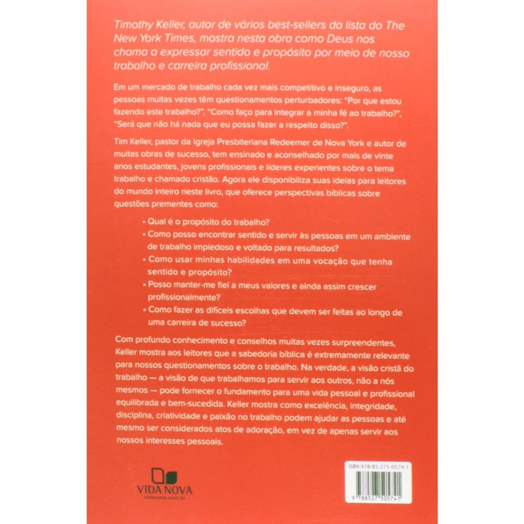 AUTOR: Timothy Keller EDITORA: Vida Nova DESCRIÇÃO DO LIVRO: Como Deus nos chama a expressar sentido e propósito por meio de nosso trabalho e carreira profissional. Tim Keller tem ensinado e aconselhado por mais de vinte anos estudantes, jovens profissionais e líderes experientes sobre o tema trabalho e chamado cristão. Agora ele disponibiliza suas ideias para leitores do mundo inteiro neste livro, que oferece perspectivas bíblicas sobre questões prementes como: - Qual é o propósito do trabalho? - Como posso encontrar sentido e servir às pessoas em um ambiente de trabalho impiedoso e voltado para resultado? - Como usar minhas habilidades em uma vocação que tenha sentido e propósito? - Posso manter-me fiel a meus valores e ainda assim crescer profissionalmente? - Como fazer as difíceis escolhas que devem ser feitas ao longo de uma carreira de sucesso? INFORMAÇÕES TÉCNICAS:Título Como integrar fé e trabalhoAutor Timothy Keller e Katherine Leary AlsdorfEditora Vida NovaPáginas 240Formato 16 x 23 cmPeso 364 g.Acabamento BrochuraISBN 9788527505741Categorias Trabalho - Vida Cristã - NegóciosEdição 2014