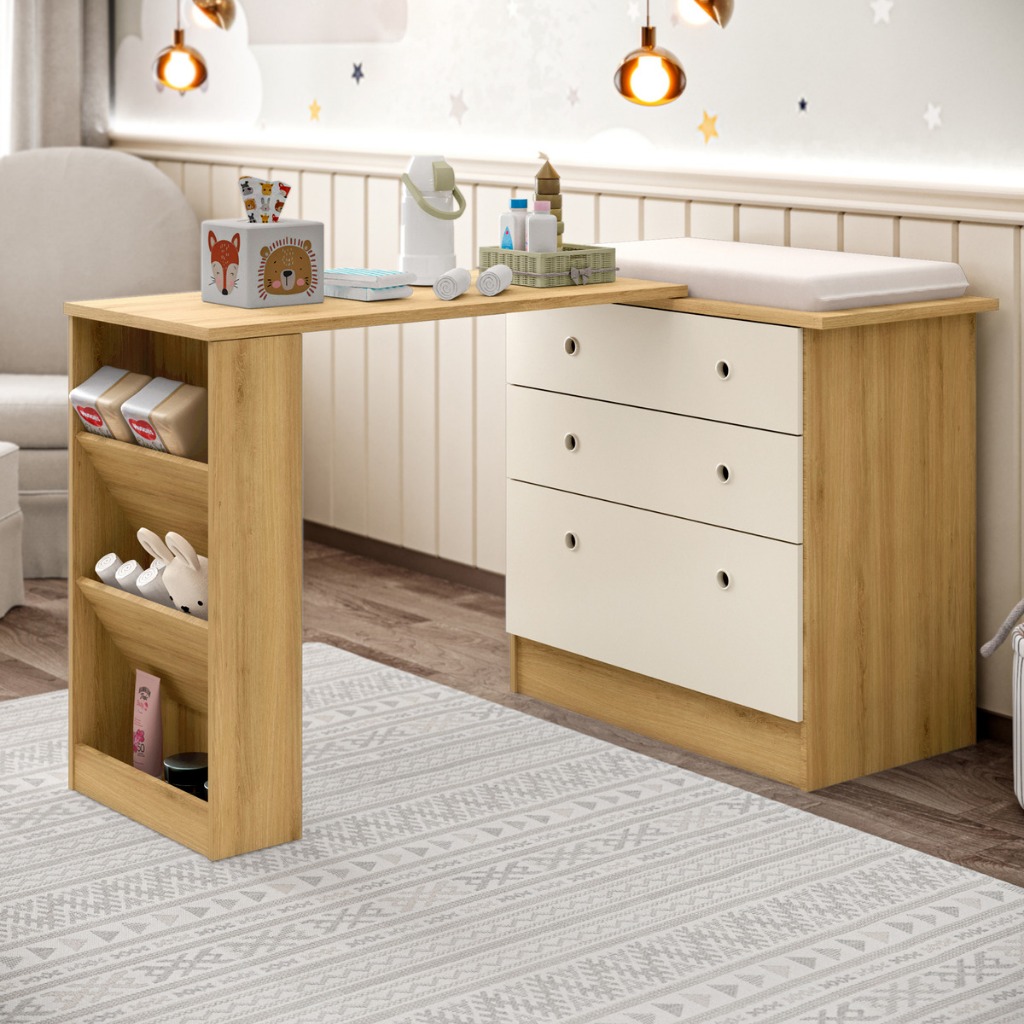 Cômoda 3 Gavetas com Bancada Giratória e Nichos Laterais Design Funcional Com Colchão Trocador