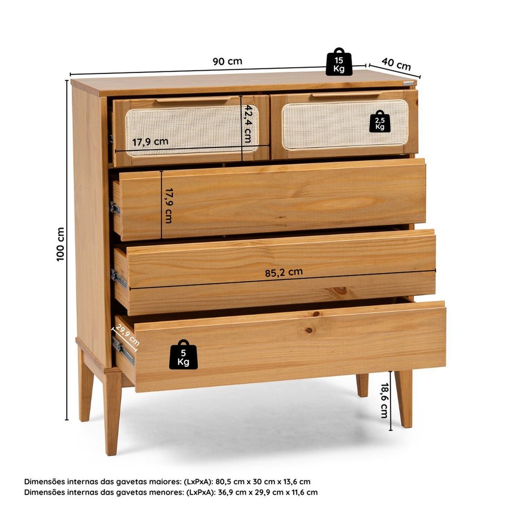 Cômoda 5 Gavetas Madeira Maciça Viena Mel