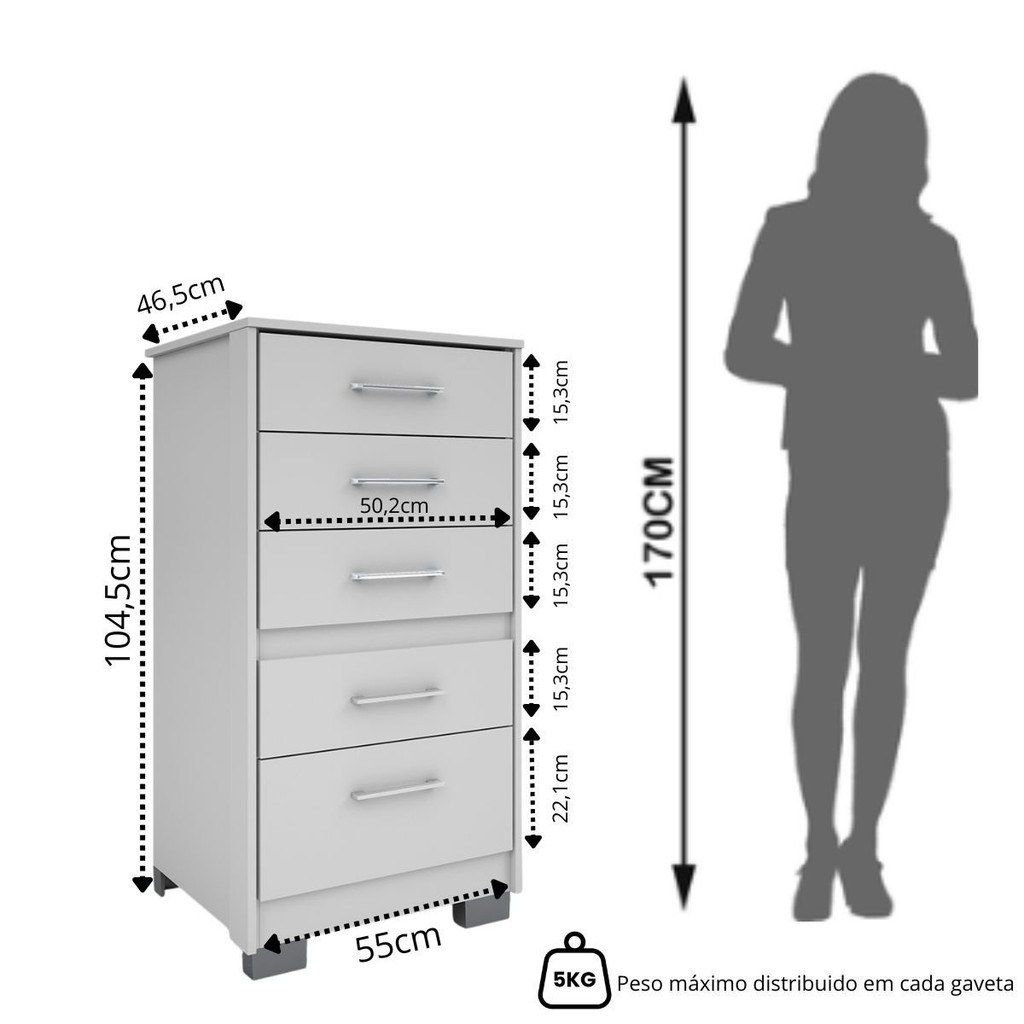 A Cômodas Batrol são ideais para quem tem espaço mais restrito e precisa de um local para guardar e organizar objetos. Na maioria das vezes, as cômodas ainda podem substituir ou complementar móveis maiores, como guarda-roupas ou armários, abrindo espaço físico e visual no ambiente. Estilo: Moderno Peso (kg): 27.6 Garantia: 03 Meses Altura (cm): 104.5 Acabamento: Pintura Largura (cm): 55 Possui Pés: 4 Possui Nichos: Não Possui Portas: Não Altura dos Pés: 5 Pés Reguláveis: Não Possui Gavetas: Sim Possui Rodízio: Não Suporta Até (kg): 25 Tipo de Cômoda: Adulto Possui Espelhos: Não Profundidade (cm): 46.5 Escala de Brilho: Semi-Brilho Gaveta com Chave: Não Material dos Pés: Plástico Serviço Montagem: 114259443 Material do Fundo: HDF Origem do Produto: Nacional Acabamento dos Pés: Liso Ambiente Principal: Quarto Material da Gaveta: MDP Material Principal: MDP Possui Prateleiras: Não Sapatas Niveladoras: Não Acabamento da Gaveta: Pintura Peso Máximo por Gaveta: 5 Tipo de Puxador da Gaveta: Externo Escala de Brilho da Gaveta: Fosco Tipo de Corrediça da Gaveta: Metálica Simples Material do Puxador da Gaveta: MDF Marca: Batrol Móveis Cor Flex: Não Cor Interna: Branco Cor: Branco Cor do Produto: Branco Itens Inclusos: Cômoda com acessórios Cor Predominante: Branco Linha ou Coleção: Primacy Cor do Puxador: Marrom Quantidade de Gavetas: 05 Gavetas