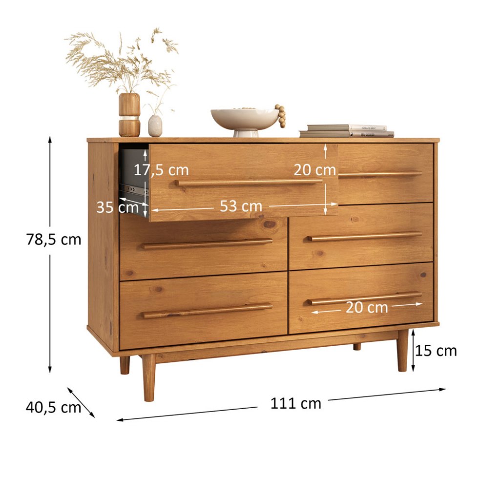 Feito de Madeira. Feito para durar. A Cômoda Grande Quarto de Casal 6 Gavetas Madeira Maciça Tecca traz o equilíbrio ideal entre design minimalista e funcionalidade. Seu acabamento em tom castanho valoriza os veios naturais da madeira, criando um móvel de presença marcante e sofisticada. Com seis gavetas espaçosas, ela é perfeita para organizar roupas, acessórios ou outros itens de forma prática e elegante. As corrediças telescópicas garantem abertura total e suave, facilitando o acesso ao conteúdo. O interior em preto, feito em MDF/MDP, acrescenta um contraste refinado e evidencia o cuidado nos detalhes. Os puxadores em madeira acompanham o design limpo das frentes, enquanto os pés cônicos levemente inclinados dão leveza ao móvel sem abrir mão da robustez da estrutura em madeira maciça. Mais do que um item de apoio, a Cômoda Tecca é um móvel versátil que se adapta a diferentes estilos de quarto e proporciona organização com sofisticação atemporal. Dimensões do Produto: Largura: 111 cm | Altura: 78,5 cm | Profundidade: 40,5 cm Materiais e Acabamento: Material da Estrutura: Madeira Maciça - Finger | Tipo da Madeira: Pinus | Fundos da Gaveta: MDF | Fundos do Móvel: MDF | Laterais da Gaveta: MDP | Puxadores: Madeira | Escala de Brilho: Fosco | Material dos Pés: Pinus Maciço | Recomendação de Limpeza: Utilize pano levemente úmido Características do Produto: Possui Gavetas: Sim | Quantidade de Gavetas: 6 Gavetas Espaçosas | Estilo: Moderno | Ambiente Principal: Quarto Adulto | Precisa de Montagem: Sim | Sistema de Montagem: Minifix / Cavilhas / Parafusos | Complexidade da Montagem: Médio | Volumes: 02 | Garantia do Fabricante: 12 meses | Montagem: Recomendamos que seja feita por um profissional | Manual de Montagem: Sim Padrão de Cor: Nossa tinta à base de água é uma opção ecologicamente consciente e segura para a pintura, além disso, a tinta à base de água permite uma visualização dos veios da madeira, indicando robustez do produto. Madeira Maciça: Nossa madeira é proveniente de recursos naturais e é tratada de forma ecologicamente correta para o bem do meio ambiente. Sua resistência e vida útil é superior a móveis de chapa MDF utilizadas pelo mercado. Nossa madeira possui mais resistência ao desgaste natural do tempo, agregando mais durabilidade ao seu produto. Pensando na qualidade dos produtos, possuímos equipes de controle de qualidade para selecionar madeiras ideais para seu produto. Diferenciais: - Produto Versátil - Design Moderno - Madeira Maciça - Mais Resistente que MDF - Móvel Sustentável - Madeira Certificada - Pintura Livre de Solventes - MDF Livre de Formaldeído - Produto Qualidade Europeia Informações Importantes: - Montagem e Desmontagem não inclusa ao produto, de responsabilidade do cliente. - Não nos responsabilizamos, no ato da entrega, por subir escadas/elevadores ou transporte por guincho em apartamentos. Eventuais despesas são de responsabilidade do comprador. - Ao receber a mercadoria, o cliente deve verificar as condições da embalagem. Caso haja alguma avaria, não assine o comprovante de recebimento. - Objetos que ambientam as fotos não acompanham o produto. - Imagens meramente ilustrativas. Cores e tonalidades podem variar. - O conjunto não pode ficar exposto ao Sol ou Chuva.