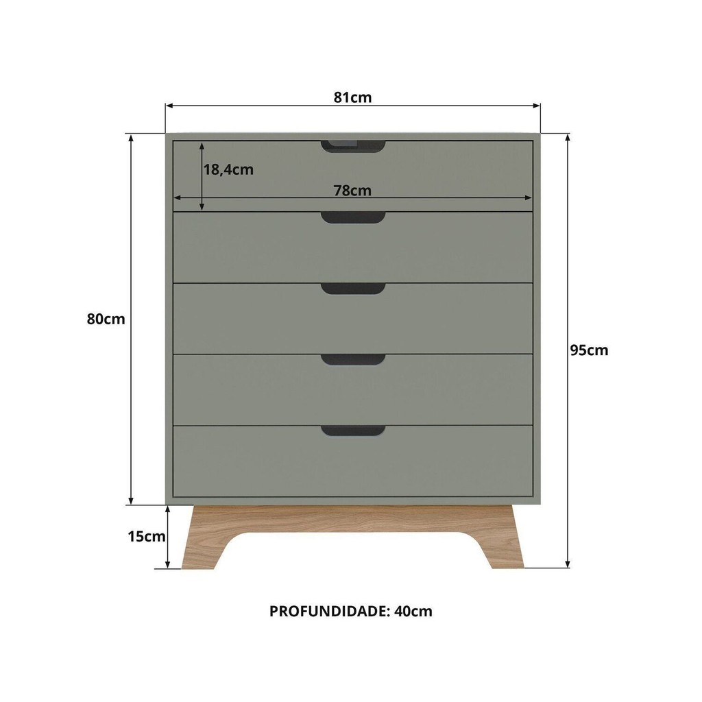 Simplicidade que faz a diferença. A Cômoda Alice 5 gavetas aposta no essencial: um design minimalista, funcional e adaptável a qualquer espaço. Com estrutura em MDF de 1,5cm, fundos de 6mm e revestimento BP, ela é resistente ao uso diário e fácil de limpar. Suas gavetas deslizantes oferecem o espaço ideal para manter roupas e objetos organizados, sem ocupar mais espaço do que o necessário. Um móvel prático e discreto, perfeito para quem valoriza a organização sem abrir mão da leveza visual.Na opção Verti (Berneck) e louro freijó grann, a variação verde possui tom verde acinzentado. Estilo: Moderno Peso (kg): 42.7 Garantia: 12 Meses Altura (cm): 95 Acabamento: Melamínico Largura (cm): 81 Possui Pés: Sim Possui Nichos: Não Possui Portas: Não Altura dos Pés: 15 Pés Reguláveis: Não Possui Gavetas: Sim Possui Rodízio: Não Suporta Até (kg): 25 Tipo de Cômoda: Adulto Possui Espelhos: Não Profundidade (cm): 40 Escala de Brilho: Fosco Gaveta com Chave: Não Material dos Pés: MDF Origem do Produto: Nacional Acabamento dos Pés: Melamínico Ambiente Principal: Quarto Material da Gaveta: MDF Material Principal: MDF Possui Prateleiras: Não Sapatas Niveladoras: Não Acabamento da Gaveta: Melamínico Peso Máximo por Gaveta: 5 Tipo de Puxador da Gaveta: Embutido Escala de Brilho da Gaveta: Fosco Tipo de Corrediça da Gaveta: Metálica Telescópica Marca: FD Cor Flex: Não Cor Interna: Branco Cor: Verde/Louro Freijó Cor do Produto: Verde/Louro Freijó Itens Inclusos: 1 Cômoda + 1 Kit de Ferragens + 1 Manual de Montagem Cor Predominante: Verde Linha ou Coleção: Móveis para quarto Quantidade de Gavetas: 05 Gavetas