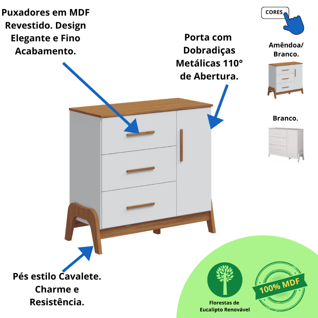 A Cômoda Faura Retro 1 Porta Lisa é a combinação perfeita de estilo e funcionalidade, feita 100% em MDF com pintura atóxica para garantir segurança e durabilidade. Seu design sofisticado destaca-se pelo caixote de 12 mm e o tampo superior robusto de 15 mm, enquanto os pés usinados em uma única peça de MDF de 25 mm proporcionam uma base sólida e elegante. Os detalhes fazem a diferença: puxadores em ABS revestido com papel melamínico adicionam um toque moderno e refinado, e as gavetas com corrediças telescópicas garantem um funcionamento suave e eficiente. Ideal para quem busca uma peça prática e de alto padrão para complementar qualquer ambiente. FICHA TÉCNICA Altura: 90,6 cm; Largura: 96,9 cm; Profundidade: 45 cm; Quantidade de Gavetas: 03 Gavetas ( Peso suportado 4Kg); Quantidade de Portas: 01 Porta; Material: 100% MDF; Cor Disponível: Amêndoa/Branco Acabamento do Produto: Pintura UV Atóxica/ Pintura PU; Tipo de Corrediça: telescópica; Tipo de Puxadores: ABS; Tipo de Pés: ABS ( Altura 8,5cm); Embalagem: Peças envoltas em isomanta, caixa de papelão revestidas com plástico termoencolhível; -Manual de Montagem: Manual segue na embalagem do produto. - Os entregadores não estão autorizados a subir escadas ou elevadores, realizando a entrega apenas na recepção ou portaria, conforme as normas trabalhistas dos transportadores. Recomendamos que os clientes considerem essa limitação ao realizar suas compras. - Imagens meramente ilustrativas: a decoração não acompanham o produto. -Recomendações de Uso, Manutenção e Limpeza: Para limpeza utilize somente pano limpo e macio, ligeiramente umedecido em água, seguido de um pano seco. Perguntas Frequentes: A - É fácil montar a Cômoda Infantil Faura Retro? Nível de complexidade alta, sugerimos a contratação de um montador especializado. Nós não realizamos a montagem dos produtos e não oferecemos esse serviço. B - Tenho a opção de comprar Berço Faura Retro, Guarda Roupa Infantil ou Cômoda Infantil separado? Sim, só buscar aqui no site que vai encontrar nossa oferta. C - Qual a configuração da Cômoda Infantil Faura Retro? É uma Cômoda infantil com 3 gavetas e 1 porta. D - Como organizar a Cômoda infantil Faura Retro? Você vai naturalmente encontrar a melhor maneira de organizar sua cômoda. Entretanto, vale a pena pontuar algumas situações: 1-A cômoda deve estar sempre limpa*; 2-O Trocador (caso você tenha) pode ocupar bastante espaço no tampo da cômoda; 3-Primeira Gaveta: Utilize para os produtos de Higiene do bebê; 4-Demais Gavetas: Utilize para roupas e acessórios do bebê.