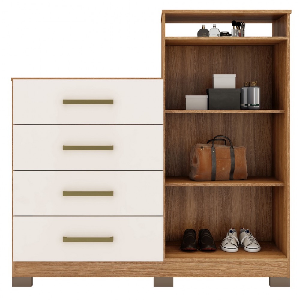 Uma cômoda elegante que complementa o ambiente e oferece muita praticidade. Com quatro gavetas espaçosa e um armário de duas portas com duas prateleiras interna, espaço para acomodação de roupas e objetos não será um problema. Ainda conta com um nicho na parte superior para itens menores ou objetos de decoração. Com puxadores na cor bronze, sua fabricação é feita em MDP de alto padrão, com acabamento resistente, proporcionado por sua pintura UV. Para garantir a qualidade do produto dentro da embalagem, as caixas são revestidas por um plástico termo encolhível e todas as peças são separadas por isomanta, tudo para preservar e evitar o atrito entre as peças dentro da embalagem. Você contará também com um manual com o passo a passo para auxiliar no momento da sua montagem. Caracteristicas: Marca: Demobile Modelo: 2 Portas 4 Gavetas Aurea Quantidade de Gavetas: 04 Quantidade de Portas: 02 (Opcional com pés) Conteúdo da embalagem: Manual de montagem: 01 Dimensões: Altura: 115 cm Largura: 120 cm Profundidade: 45 cm Peso: 42,3 Kg Garantia do fornecedor: 03 meses