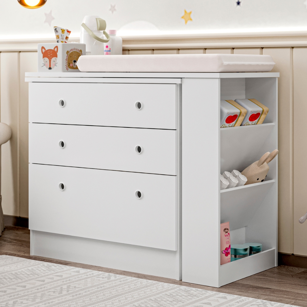 🍼 CÔMODA TROCADOR GIRATÓRIA 3 EM 1 COM NICHOS + COLCHÃO IMPERMEÁVEL INCLUSO ✅ Colchão impermeável incluso ✅ Gira 360º – acesso mais fácil e rápido ✅ Nichos organizadores laterais ✅ 2 gavetas + 1 gavetão com corrediça metálica ✅ Design moderno em MDF branco ✅ Montagem fácil com manual incluso A solução ideal para o quarto do seu bebê! A Cômoda Giratória 3 em 1 une praticidade, beleza e organização em um único móvel multifuncional. Perfeita para pais que buscam otimizar o espaço e tornar o momento da troca mais prático e seguro. ✨ DESTAQUES DO PRODUTO: 🔄 Bancada giratória inteligente A parte superior gira com suavidade, facilitando o acesso ao trocador e aos nichos laterais. 🧺 Espaço que faz a diferença 2 gavetas e 1 gavetão com amplo espaço para fraldas, roupinhas e acessórios. Nichos laterais ideais para deixar à mão pomadas, toalhinhas e brinquedos. 🧼 Fácil de limpar e segura para o bebê Pintura UV atóxica Colchão com capa impermeável Estrutura em MDP de alta resistência Puxadores em PVC 🛠️ Montagem descomplicada Manual incluso para você montar sem dor de cabeça! 📐 DIMENSÕES: Altura: 76 cm Largura: 91 cm Profundidade: 42 cm 📦 ITENS INCLUSOS: 1 Cômoda Trocador 1 Colchão Impermeável 1 Manual de Montagem