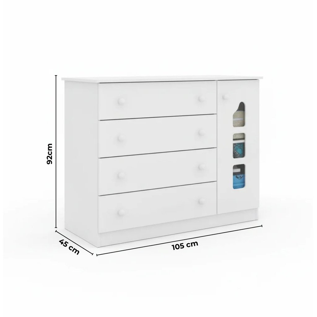 Cômoda Infantil 100% MDF 4 Gavetas e 1 Porta com Cabideiro Lívia Branco Branco