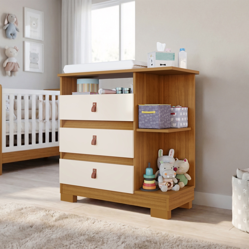 Cômoda Infantil 3 Gavetas com Nichos e trocador Organizador Quarto Bebê Multiuso com Puxadores