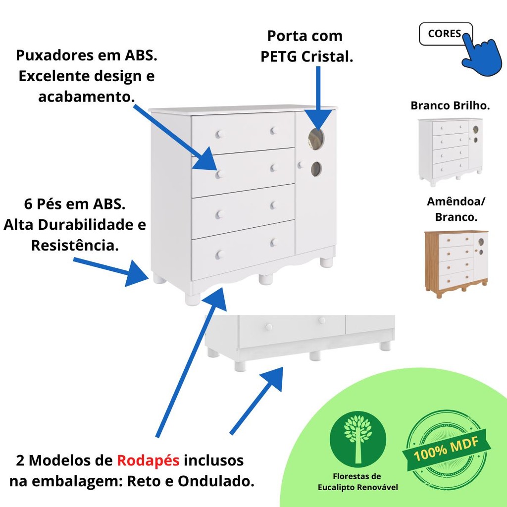 A Cômoda Infantil Bolinha é um produto que atende a diversos ambientes de sua casa, ideal para seu bebê, sua criança e até para uso adulto. Possui o tampo com bordas laqueadas e tem o diferencial do rodapé que pode ser montado no desenho reto ou com o rodapé ondulado. Altura: 88 cm; Largura: 95,3 cm; Profundidade: 42 cm; Quantidade de Gavetas: 04 Gavetas ( Peso suportado 4Kg); Quantidade de Portas: 01 Porta; Material: 100% MDF; Acabamento do Produto: Pintura UV Atóxica/ Pintura PU e Fita de Bordo; Acabamento das Portas: PETG Cristal ( Acrílico transparente ); Tipo de Corrediça: Telescópicas; Tipo de Cabideiro: Metálico; Tipo de Puxadores: ABS; Tipo de Pés: ABS( Altura 6cm); -Manual de Montagem: Manual segue na embalagem do produto - Os entregadores não estão autorizados a subir escadas ou elevadores, realizando a entrega apenas na recepção ou portaria, conforme as normas trabalhistas dos transportadores. Recomendamos que os clientes considerem essa limitação ao realizar suas compras - Imagens meramente ilustrativas: a decoração não acompanham o produto. -Recomendações de Uso, Manutenção e Limpeza: Para limpeza utilize somente pano limpo e macio, ligeiramente umedecido em água, seguido de um pano seco. Perguntas Frequentes: A - É fácil montar a Cômoda Infantil Bolinha? Sim, é fácil. Ao abrir a embalagem pode parecer complicado, mas é só seguir o passo a passo no manual de montagem que você consegue! B - Tenho a opção de comprar berço e cômoda juntos? Sim, só buscar aqui no site que vai encontrar nossa oferta. C - Qual a configuração da Cômoda Infantil Bolinha? É uma cômoda infantil com 4 gavetas e 1 porta. E - Como organizar a Cômoda Infantil Bolinha? Você vai naturalmente encontrar a melhor maneira de organizar sua cômoda. Entretanto, vale a pena pontuar algumas situações: 1-A cômoda deve estar sempre limpa*; 2-O Trocador (caso você tenha) pode ocupar bastante espaço no tampo da cômoda; 3-Primeira Gaveta: Utilize para os produtos de Higiene do bebê; 4-Demais Gavetas: Utilize para roupas e acessórios do bebê. D - Quais as cores disponíveis para a Cômoda Infantil Bolinha? Temos nas cores: Branco Brilho, Amêndoa/Branco. E - Onde comprar a Cômoda Infantil Bolinha com segurança? Aqui é o site com o melhor preço e condições de entrega para você comprar.