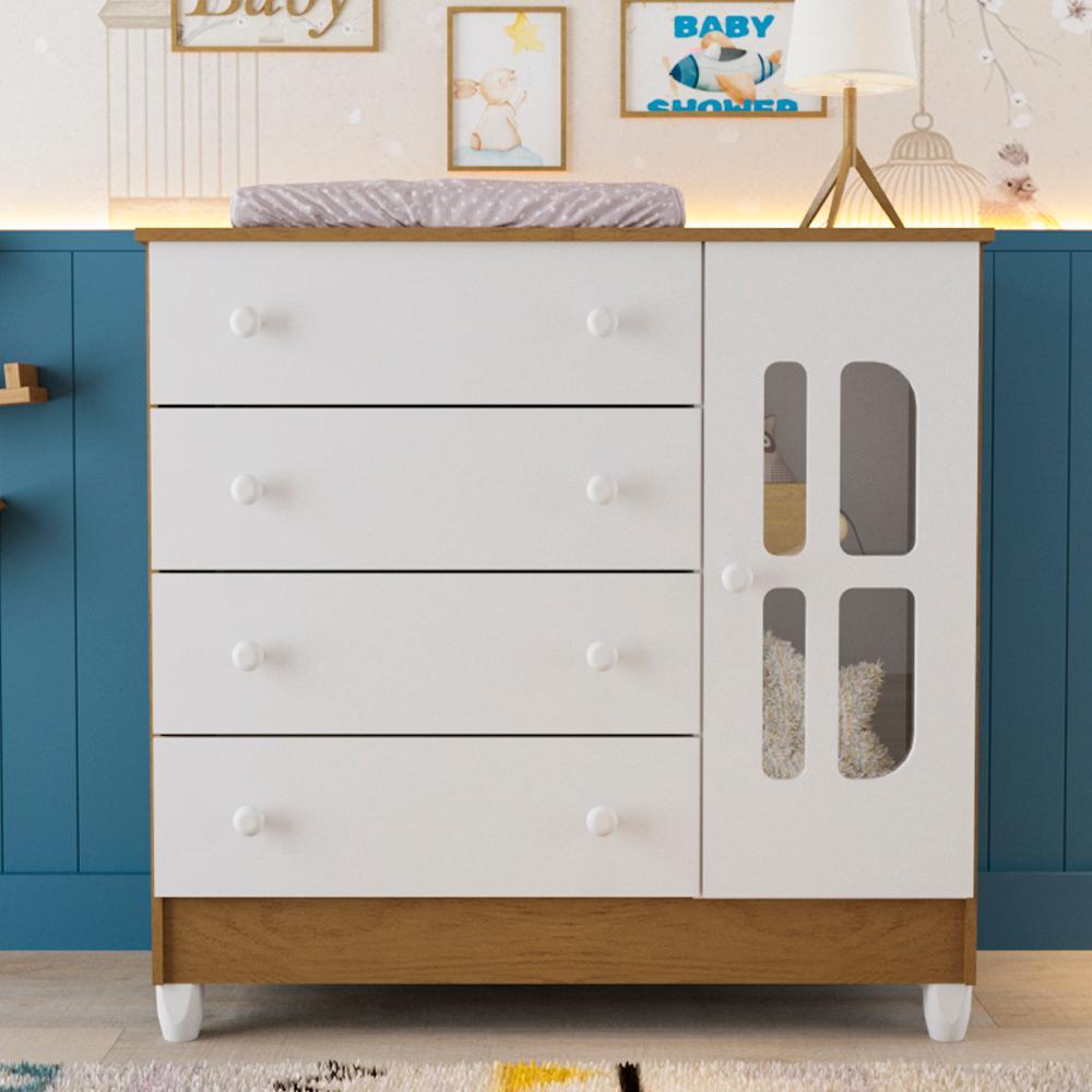 Cômoda Infantil 4 Gavetas com Porta Fraldário Gabrielle 100% MDF Branco Bétula