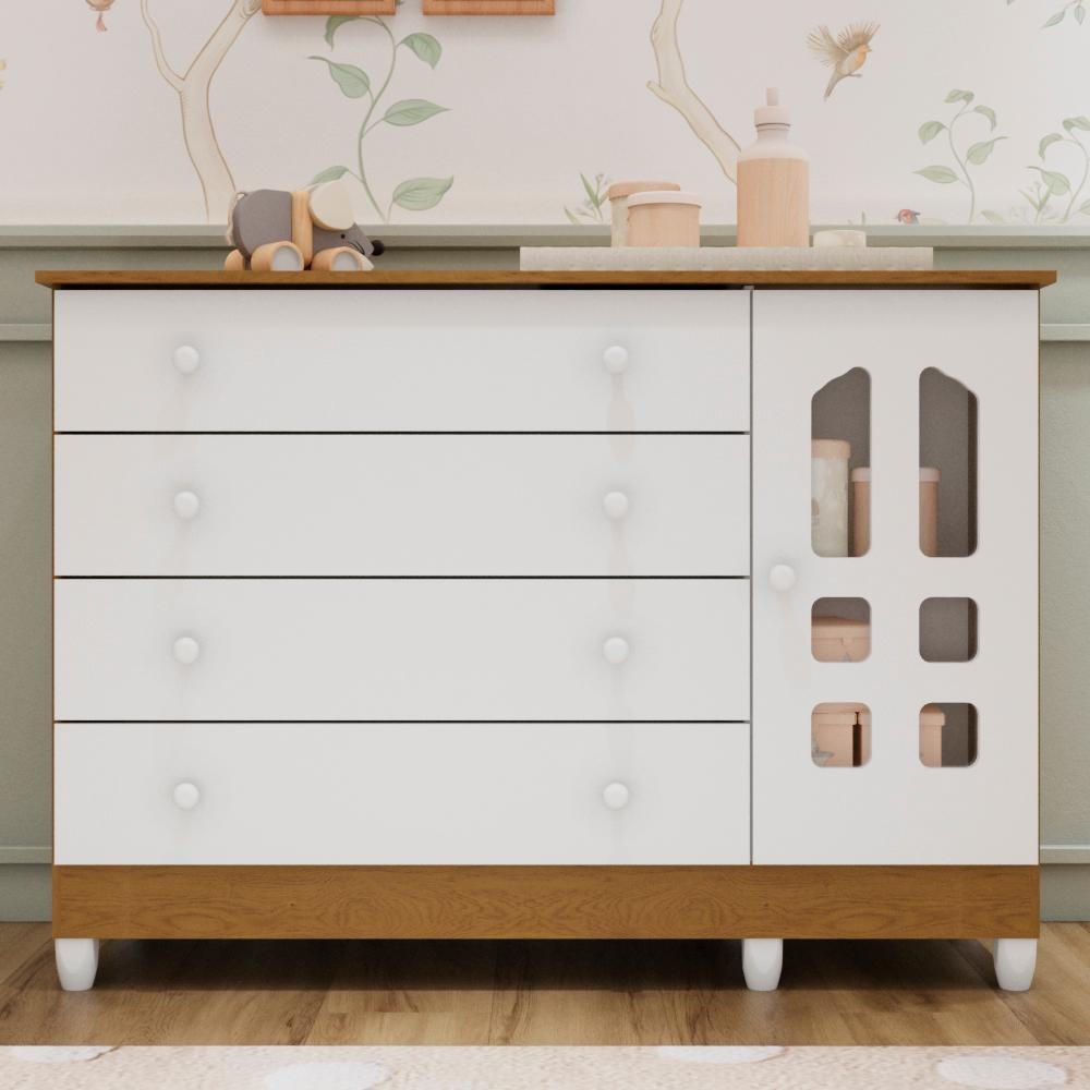 Cômoda Infantil 4 Gavetas com Porta Fraldário Gran Selena 100% MDF Branco Bétula