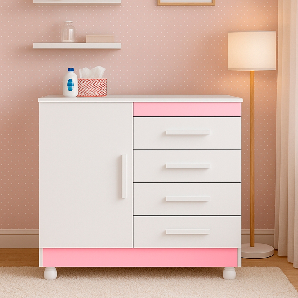 Cômoda Infantil Bebê 4 Gavetas 1 Porta Flex Branco Rosa Quarto Organizador Roupas Fraldas pés