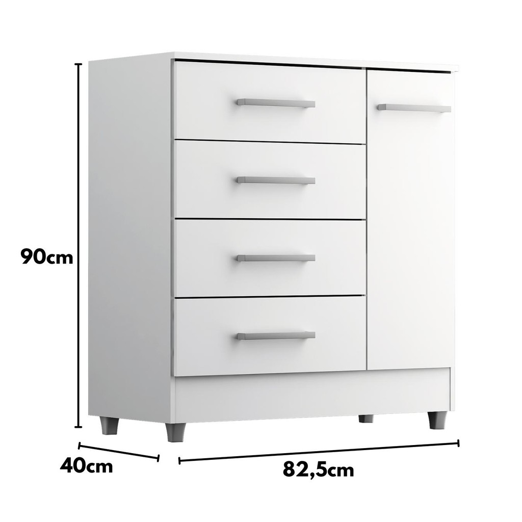 A Cômoda Infantil Laura é perfeita para quem busca um móvel bonito, funcional e compacto para o quarto dos pequenos. Com 4 gavetas espaçosas e 1 porta com prateleira interna, ela oferece o espaço ideal para guardar roupinhas, fraldas, brinquedos e acessórios, mantendo tudo sempre em ordem e ao alcance. Diferenciais da comoda infantil Laura: • 4 gavetas com corrediças metálicas, maior suavidade ao abrir e fechar; • 1 porta com dobradiças metálicas e 1 prateleira interna para organização adicional; • Puxadores em PVC, resistentes e de fácil manuseio; • Suporta até 7kg por gaveta e 20kg no tampo; • Fabricado em MDP • Acabamento Touch Alto-Relevo ou Alto Brilho UV; • Pés de plástico PVC inclusos, para facilitar a limpeza e proteger o móvel da umidade; • Acompanha manual de montagem.; Medidas: Altura: 90 cm Largura: 82,5 cm Profundidade: 40 cm Peso: 28 kg Medida das gavetas: 53,6 cm (largura) x 17,7 cm (altura) x 36 cm (profundidade) Importante: A montagem não está inclusa. Para sua segurança e melhor resultado, indicamos a contratação de um profissional especializado ou serviço de montagem terceirizado. (imagens meramente ilustrativas)
