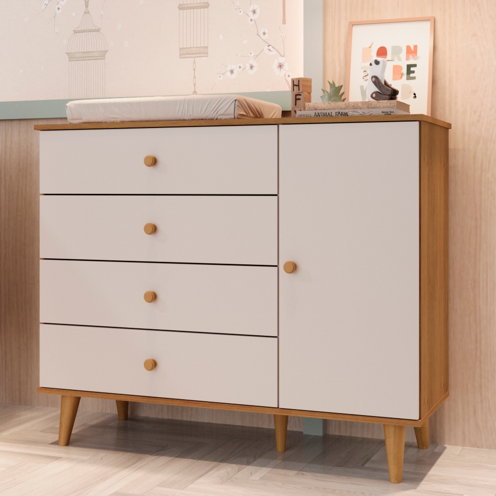 Cômoda Infantil Retrô 4 Gavetas com Porta Fraldário Pés Palito Lígia MDF Off White