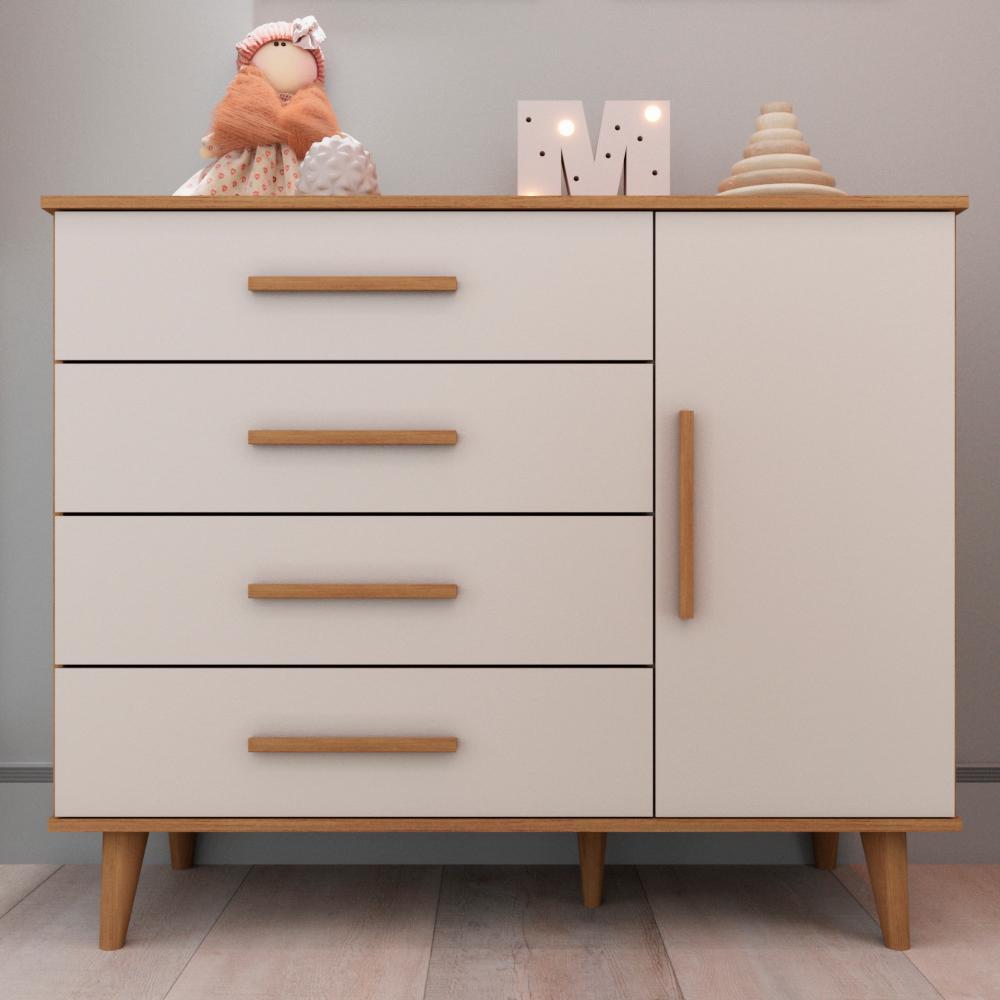 Cômoda Infantil Retrô 4 Gavetas com Porta Fraldário Pés Palito Ludmila MDF Off White