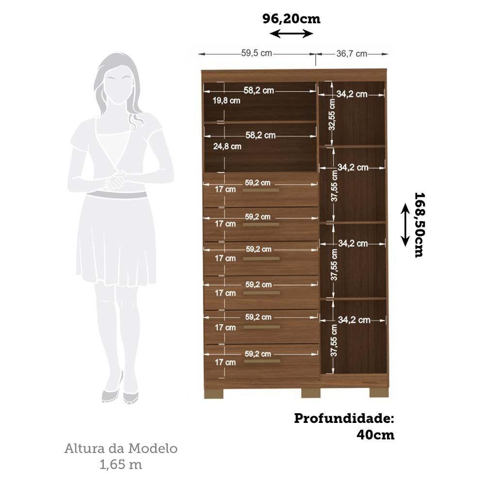 Cômoda Multiuso 1 Porta 6 Gavetas Com Pés Marabá Santos Andirá Jatoba A Comoda Multiuso Maraba e um movel incrivel que pode ser utilizado em varios ambientes da casa: na cozinha, na garagem, no quarto, na lavandeira. Suas inumeras utilidades permitem guardar muitos objetos. Possui 6 gavetas amplas com corredicas metalicas e 1 porta com varias prateleiras. E muito espaco para guardar tudo que precisa. Caracteristicas Material da Estrutura: MDP Tipo de Acabamento: Pintura UV Quantidade de Portas: 1 Tipo de Abertura das Portas: Articuladas com dobradicas Metalicas Quantidade de Gavetas: 6 Tipo de Corredicas: Metalicas Telescopicas Tipo de Puxadores: Plastico ABS Quantidade de Prateleiras: 4 Itens Inclusos na embalagem: Comoda, kit ferragens e manual de montagem. Sistema de Montagem: Cavilhas, Parafusos e Minifix Recomendacao de Limpeza: Nao limpar com alcool ou qualquer outro produto quimico, utilize somente pano seco ou levemente umedecido. Garantia do Fabricante: 3 meses Informacoes Complementares: Estrutura em MDP 12mm, fundo em HDF 2,5mm, frente das gavetas, portas e tampo superior em MDP 15mm. 1 Cabideiro em aluminio. Pes em plastico ABS com 5cm. Tampo suporta ate 20kg, gaveta 3kg e prateleira 5kg. Dimensoes do Produto Altura: 168,5cm Largura: 96,2cm Profundidade: 40cm Peso liquido: 50,9kg