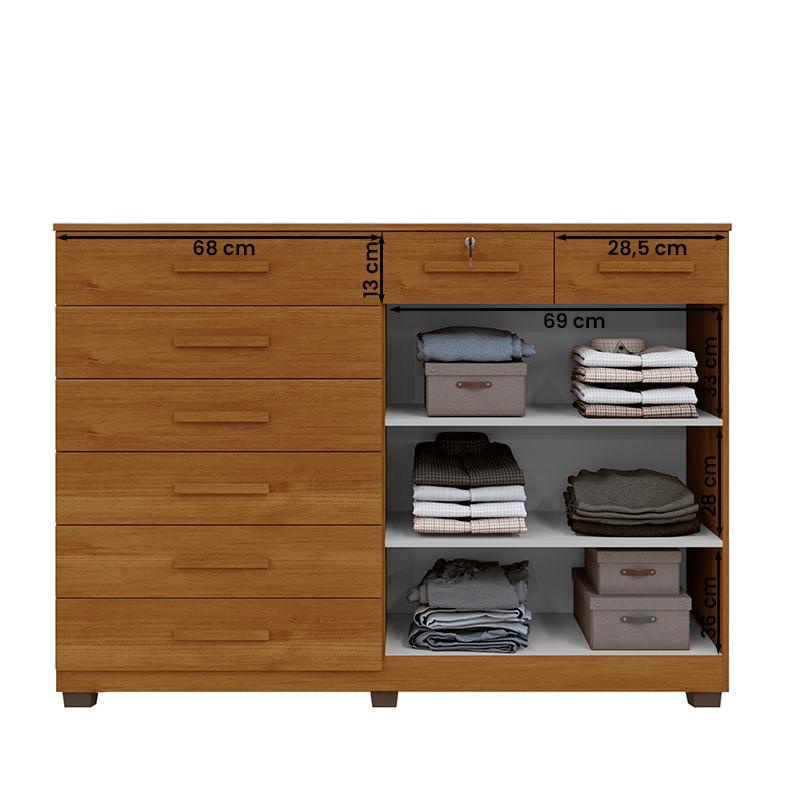Modelo: Cômoda New Triunfo; Material: MDP 15 mm com pés de PVC (plástico); Altura: 137 cm; Largura: 148 cm; Profundidade: 45 cm; Quantidade de portas: 02; Tipo de dobradiças: de pressão em aço; Quantidade de gavetas: 08, sendo 1 com chave; Tipo de corrediças: Telescópica; Com puxador: Sim, madeirado; Quantidade de prateleiras: 02, interna; Com Cabideiro: Não se aplica; Peso suportado: até 55 kg distribuídos; Requer montagem: Sim (kit montagem incluso); Embalagem do envio: Papelão e plástico. Informações adicionais: - Os objetos que ambientam as fotos não acompanham o produto; - O produto será entregue desmontado - É de inteira responsabilidade do cliente a montagem do produto e/ou instalação, custos de transporte por escadas e/ou elevadores, guincho ou içamento, assim como possíveis irregularidades provenientes de manuseio inadequado; - Embora o produto acompanhe o manual de montagem, verifique a complexidade antes de decidir montá-lo sozinho, recomendamos que contrate um profissional de sua confiança; - Fique atento, nossas cores podem sofrer alterações dependendo do seu monitor; - ANTES DE MONTAR O SEU PRODUTO, certifique-se que todas as instruções dispostas no manual, bem como todas as ferragens descritas, estejam presentes dentro da embalagem. Verifique se há alguma peça danificada, caso esteja, prestaremos a devida assistência dentro do prazo da garantia.