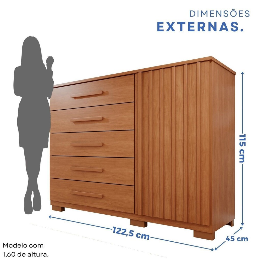 Cômoda com 1 porta e 5 gavetas, fabricada com estrutura de 15mm, garantindo resistência e durabilidade. As chapas em Perfect Wood oferecem alta resistência a fungos e bactérias, garantindo mais higiene e durabilidade. A tecnologia de termo-fusão reforça a estrutura, proporcionando maior resistência ao uso diário. Um material inovador que une qualidade, segurança e longa vida útil. Gavetas espaçosas permitem armazenar roupas, acessórios e diversos itens com praticidade. Perfeita para complementar qualquer ambiente com elegância e utilidade. Estilo: Moderno Peso (kg): 58.2 Garantia: 03 Meses Altura (cm): 115 Acabamento: Melamínico Largura (cm): 122.5 Possui Pés: Sim Possui Nichos: Não Possui Portas: Sim Tipo de Porta: Bater Possui Gavetas: Sim Possui Rodízio: Não Suporta Até (kg): 25 Possui Espelhos: Não Profundidade (cm): 45 Escala de Brilho: Fosco Gaveta com Chave: Não Material dos Pés: PVC Material da Porta: MDP Material do Fundo: MDF Origem do Produto: Nacional Ambiente Principal: Quarto Material da Gaveta: MDP Material Principal: MDP Possui Prateleiras: Sim Acabamento da Porta: Melamínico Sapatas Niveladoras: Não Acabamento da Gaveta: Melamínico Material da Prateleira: MDP Peso Máximo por Gaveta: 3 Acabamento da Prateleira: Melamínico Tipo de Puxador da Porta: Não Possui Escala de Brilho da Porta: Fosco Tipo de Puxador da Gaveta: Externo Peso Máximo por Prateleira: 5 Tipo de Corrediça da Gaveta: Metálica Telescópica Escala de Brilho da Prateleira: Fosco Tipo de Dobradiça/Corrediça da Porta: Aço Marca: Espresso Móveis Cor do Produto: Cinamomo Itens Inclusos: 1 Cômoda, Manual de Montagem e Kit Ferragens. Cor Predominante: Marrom Linha ou Coleção: Jaspe Quantidade de Portas: 1 Porta Quantidade de Gavetas: 05 Gavetas