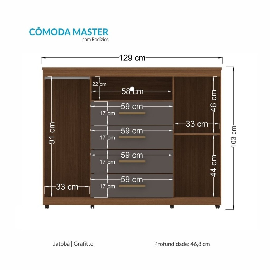 Cômoda para Quarto 2 Portas 4 Gavetas 1 Nicho Master com Rodízios Jatoba/Grafite