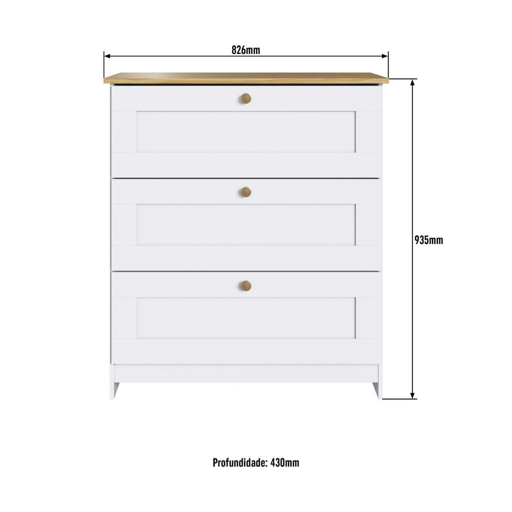 O dormitório Americano é sofisticado, aconchegante e cheio de estilo. A cômoda com três gavetas espaçosas, com corrediças metálicas, tem lindos puxadores em ponto dourados, que dão um toque a mais de beleza ao móvel. Todas as peças do produto são numeradas para facilitar no momento da montagem. Estilo: Clássico Peso (kg): 29.4 Garantia: 03 Meses Altura (cm): 93.5 Acabamento: Pintura UV Largura (cm): 82.6 Possui Pés: Não Possui Nichos: Não Possui Portas: Não Possui Gavetas: Sim Suporta Até (kg): 14 Possui Espelhos: Não Profundidade (cm): 43 Escala de Brilho: Semi-Brilho Gaveta com Chave: Não Material do Fundo: MDF Origem do Produto: Nacional Ambiente Principal: Quarto Material da Gaveta: MDP Material Principal: MDP Possui Prateleiras: Não Sapatas Niveladoras: Não Acabamento da Gaveta: Pintura UV Peso Máximo por Gaveta: 2 Tipo de Puxador da Gaveta: Externo Tipo de Corrediça da Gaveta: Metálica Material do Puxador da Gaveta: ABS Marca: Decibal Cor Interna: Branco Gelo Cor do Produto: Branco Gelo/Ipê Itens Inclusos: 1 Cômoda, Kit de Ferragens e Manual de Montagem. Cor Predominante: Branco Linha ou Coleção: Americano Quantidade de Gavetas: 03 Gavetas