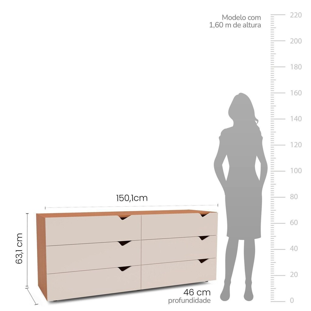 A cômoda 6 gavetas Porto, da Politorno Móveis, combina design moderno, elegante e sofisticado, agregando requinte ao ambiente. Produzida em MDP/MDF, conta com acabamento em pintura UV e FF, proporcionando maior resistência e durabilidade. Seus puxadores embutidos garantem um visual clean e sofisticado, enquanto as corrediças telescópicas oferecem um deslizamento suave das gavetas. Com 63,1 cm de altura, 150,1 cm de largura e 46 cm de profundidade, é ideal para organizar roupas e acessórios, sendo uma excelente opção para quartos e closets. De alta qualidade, essa cômoda une funcionalidade e estilo para um ambiente bem estruturado. Estilo: Moderno Peso (kg): 46.13 Garantia: 06 Meses Altura (cm): 63.1 Acabamento: Pintura UV Largura (cm): 150.1 Possui Pés: Sim Possui Nichos: Não Possui Portas: Não Pés Reguláveis: Não Possui Gavetas: Sim Possui Rodízio: Não Suporta Até (kg): 30 Tipo de Cômoda: Adulto Possui Espelhos: Não Profundidade (cm): 46 Escala de Brilho: Semi-Fosco Gaveta com Chave: Não Material dos Pés: Plástico Material do Fundo: MDF/MDP Origem do Produto: Nacional Acabamento dos Pés: Poliéster Ambiente Principal: Quarto Material da Gaveta: MDF/MDP Material Principal: MDF/MDP Possui Prateleiras: Não Sapatas Niveladoras: Sim Acabamento da Gaveta: Pintura UV Peso Máximo por Gaveta: 5 Tipo de Puxador da Gaveta: Embutido Escala de Brilho da Gaveta: Semi-Fosco Tipo de Corrediça da Gaveta: Metálica Telescópica Marca: Politorno Cor Interna: Freijó Cor: Freijó/Creme Cor do Produto: Freijó/Creme Itens Inclusos: 1 Cômoda, Kit de Ferragens, Manual de Montagem e Termo de Garantia Cor Predominante: Bege Linha ou Coleção: Porto Quantidade de Portas: Não Possui Quantidade de Gavetas: 06 Gavetas