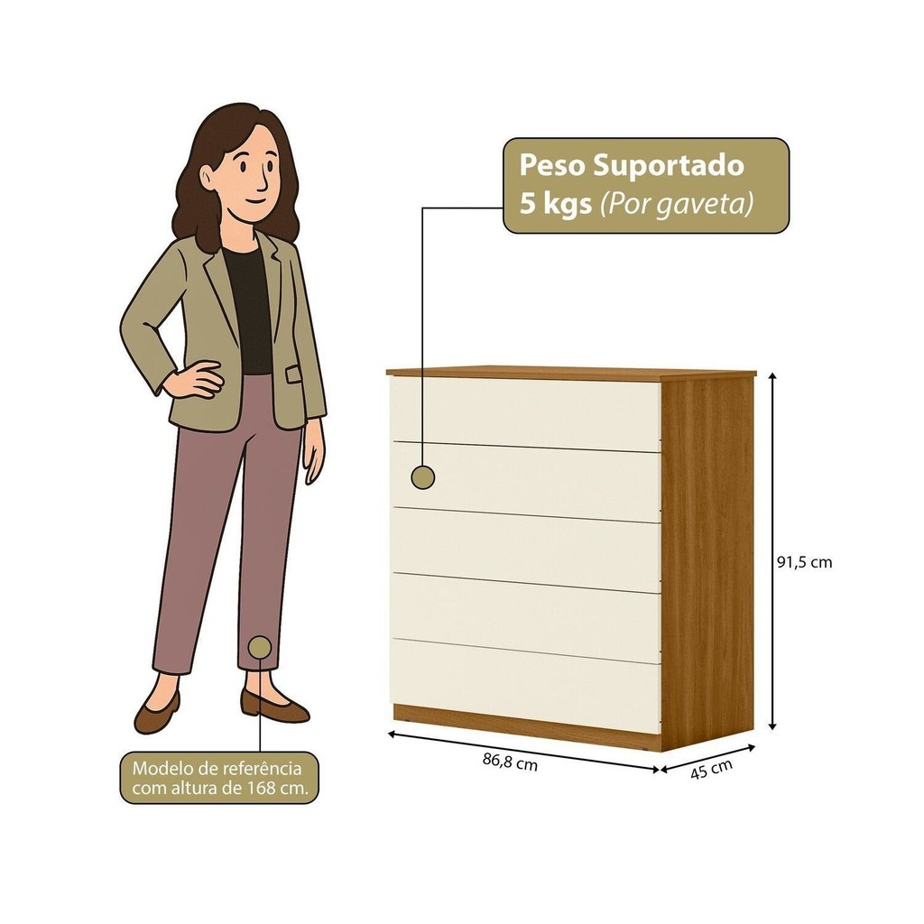 Cômoda para Quarto com 5 Gavetas 86,8cm X 91,5cm Compacta Freijó/Off White