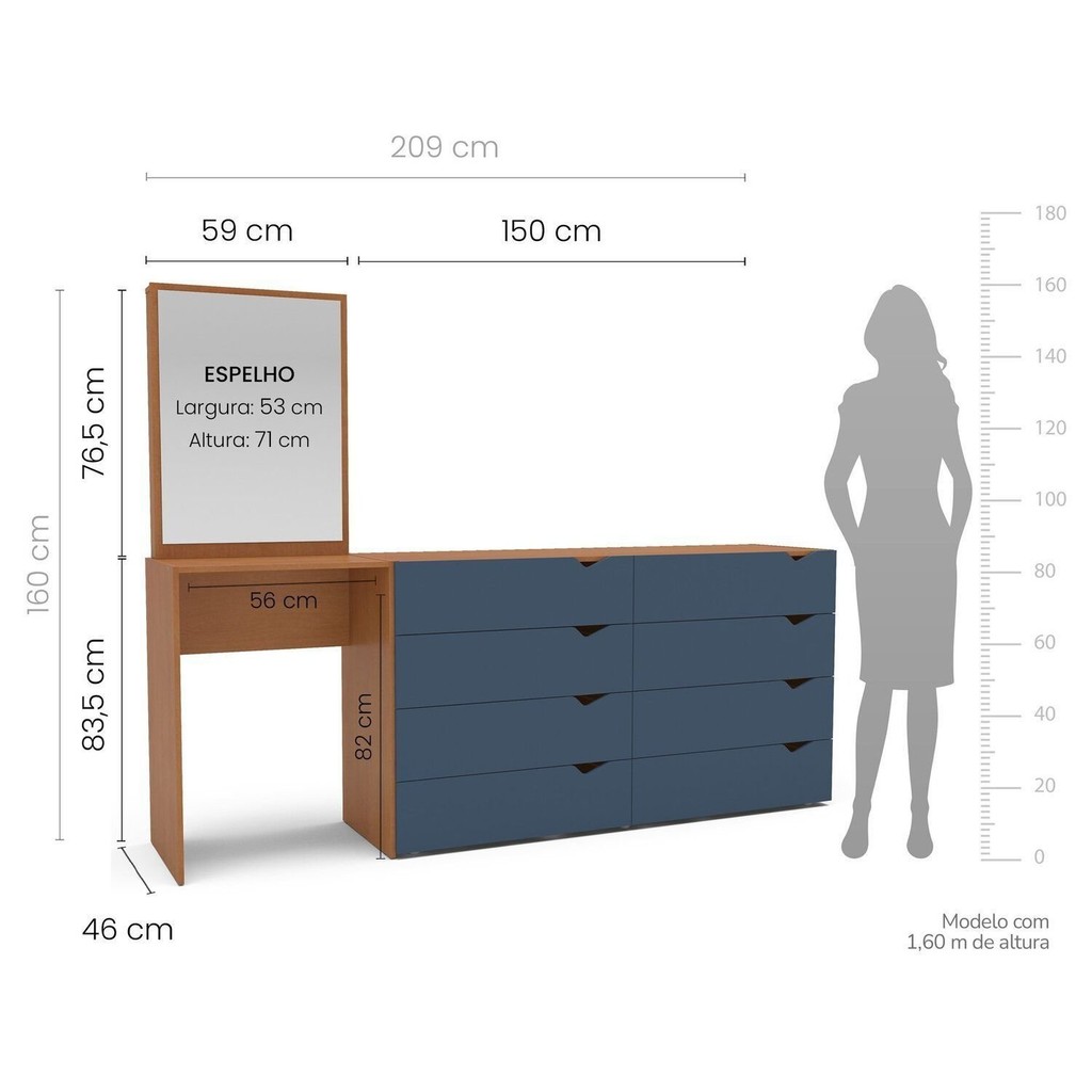 Cômoda Penteadeira 8 Gavetas com Espelho Porto Azul/Freijó
