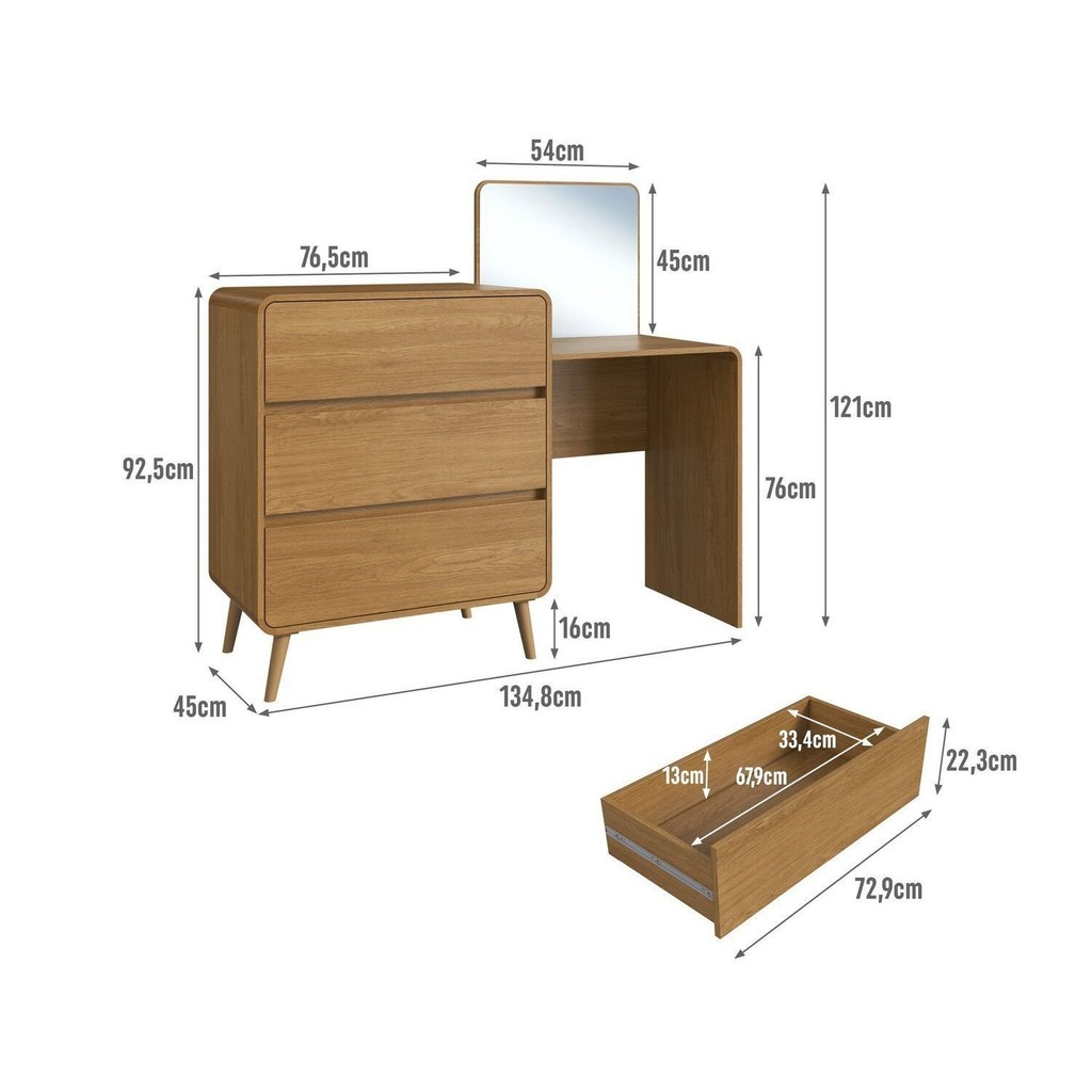 A Cômoda Penteadeira com 03 Gavetas Linha Curve da Completa Móveis apresenta funcionalidade, praticidade e elegância com design arrojado e atemporal! Com cantos arredondados, traz uma leveza ao ambiente. As molduras laterais arredondadas são em MDF, garantindo qualidade superior. Possui três gavetas com corrediças telescópicas e pés plásticos. Penteadeira contemporânea com espelho em cantos arredondados. Um verdadeiro charme pra maquiagem perfeita! O produto é entregue desmontado. Estilo: Moderno Peso (kg): 44.4 Garantia: 06 Meses Altura (cm): 121 Acabamento: BP Largura (cm): 134.8 Possui Pés: Sim Possui Vidro: Não Possui Portas: Não Altura dos Pés: 16 Possui Gavetas: Sim Possui Rodízio: Não Suporta Até (kg): 27 Possui Espelhos: Sim Profundidade (cm): 45 Escala de Brilho: Fosco Gaveta com Chave: Não Material dos Pés: Plástico Altura do Espelho: 45 Origem do Produto: Nacional Possui Iluminação: Não Acompanha Banqueta: Não Ambiente Principal: Quarto Largura do Espelho: 54 Material da Gaveta: MDP Material Principal: MDP Possui Prateleiras: Não Sapatas Niveladoras: Não Acabamento da Gaveta: BP Espessura do Espelho: 3 Possui Porta Objetos: Sim Peso Máximo por Gaveta: 4 Quantidade de Espelhos: 1 Tipo de Puxador da Gaveta: Embutido Escala de Brilho da Gaveta: Fosco Tipo de Fixação do Espelho: Fita Dupla Face Tipo de Corrediça da Gaveta: Metálica Telescópica Marca: Completa Móveis Cor Interna: Marrom Cor do Produto: Carvalho Xingu Itens Inclusos: 1 Cômoda, Kit Ferragens e Manual de Montagem Cor Predominante: Marrom Linha ou Coleção: Curve