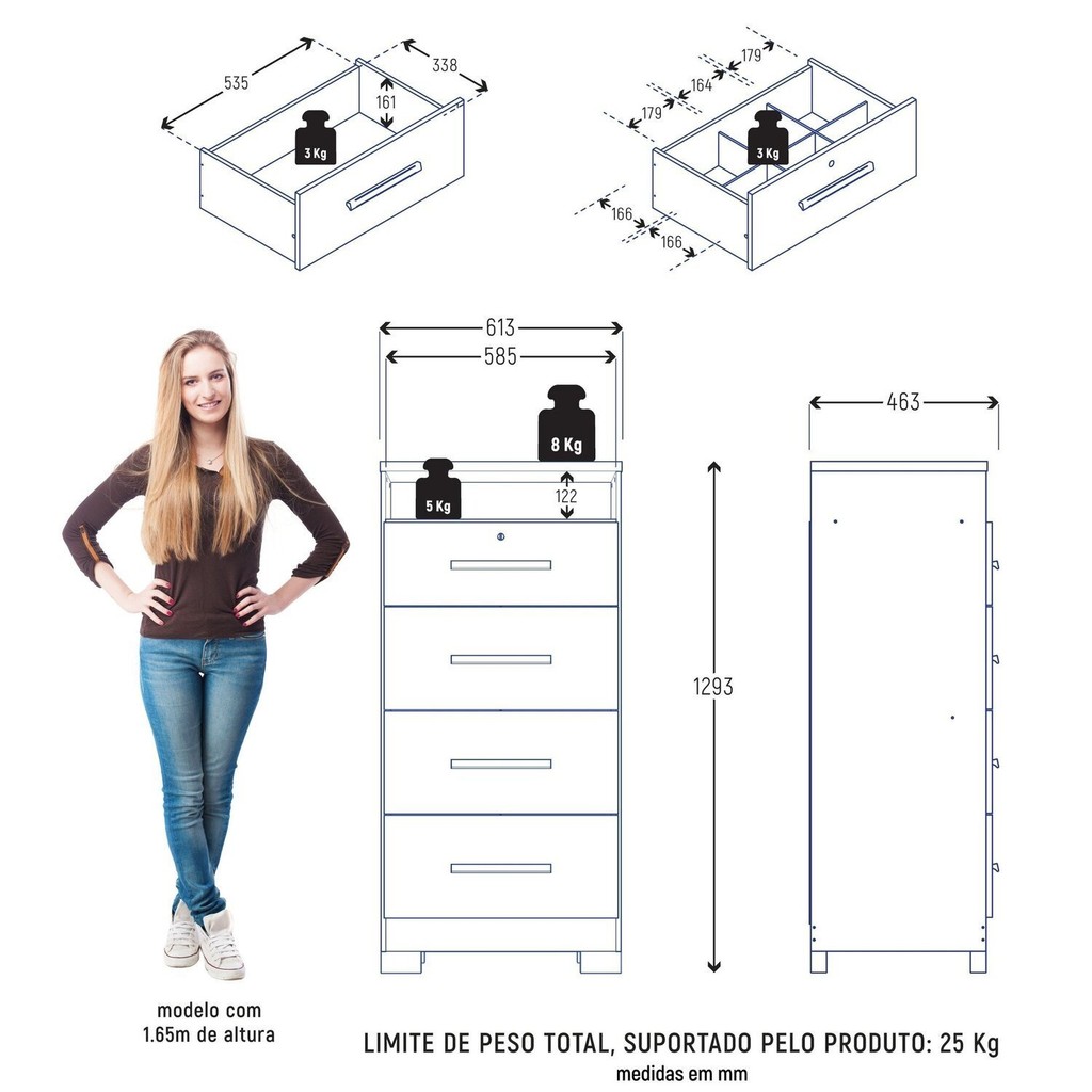Conheça a Cômoda Primordial Max, a combinação perfeita de estilo e funcionalidade para seu espaço! Com 4 gavetas equipadas com corrediças metálicas, ela oferece um deslizar suave e durável. A primeira gaveta vem com divisórias e chave, garantindo organização e segurança para seus itens mais preciosos. Seus puxadores em MDF e o tampo em MDP de 25mm garantem robustez e elegância. O acabamento interno é igual ao externo, proporcionando um visual impecável em todos os ângulos. Transforme seu ambiente com a sofisticação e praticidade da Primordial Max! Estilo: Moderno Peso (kg): 35.5 Garantia: 03 Meses Altura (cm): 129.3 Acabamento: Pintura Texturizada UV Largura (cm): 61.3 Possui Pés: Sim Possui Nichos: Não Possui Portas: Não Pés Reguláveis: Não Possui Gavetas: Sim Possui Rodízio: Não Suporta Até (kg): 25 Tipo de Cômoda: Adulto Possui Espelhos: Não Profundidade (cm): 46.3 Escala de Brilho: Fosco Gaveta com Chave: Sim Material dos Pés: Plástico Material do Fundo: MDP Origem do Produto: Nacional Ambiente Principal: Quarto Material da Gaveta: MDP Material Principal: MDP Possui Prateleiras: Não Sapatas Niveladoras: Não Acabamento da Gaveta: Pintura Texturizada UV Peso Máximo por Gaveta: 3 Tipo de Puxador da Gaveta: Externo Escala de Brilho da Gaveta: Fosco Tipo de Corrediça da Gaveta: Metálica Material do Puxador da Gaveta: MDF Marca: Zanzini Cor Interna: Cinamomo Cor: Cinamomo Cor do Produto: Cinamomo Itens Inclusos: 1-Cômoda Primordial MAX + Manual de Montagem Cor Predominante: Marrom Linha ou Coleção: Primordial Cor do Puxador: Marrom Quantidade de Gavetas: 04 Gavetas