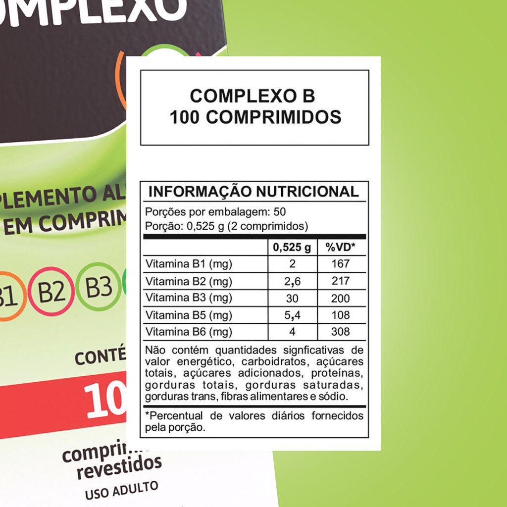 Complexo B 100 Comprimidos - Arte Nativa As vitaminas do Complexo B são um grupo de oito vitaminas: Tiamina (B1), riboflavina (B2), niacina (B3), ácido pantotênico (B5), piridoxina (B6). Estas vitaminas são essenciais para a decomposição química de carboidratos em glicose, fornecendo energia para o organismo; para a decomposição química das gorduras e proteínas, ajudando no funcionamento normal do sistema nervoso; e para o tônus muscular no estômago e no trato intestinal.