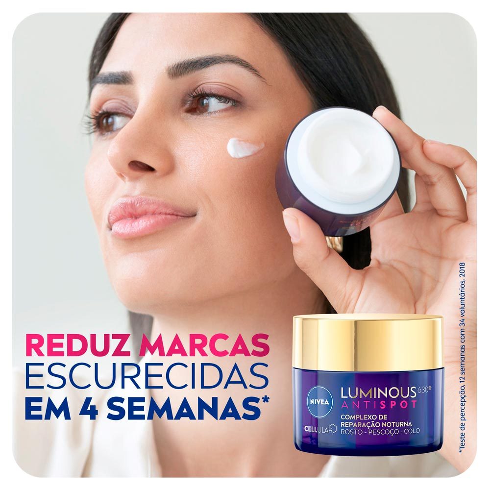O que é? O NIVEA Complexo de Reparação Noturna Luminous 630® é um complexo de preparação noturna, que reduz marcas escurecidas no rosto, pescoço e colo. Para que servem? Com fórmula enriquecida com