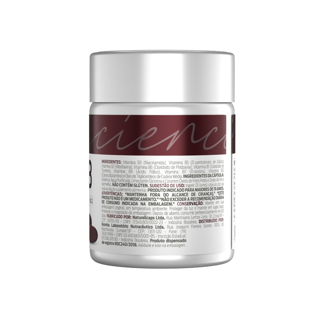 COMPLEXO B Ingredientes: Vitamina B3 (Niacinamida), Vitamina B5 (D-pantotenato de Cálcio), Vitamina B2 (Riboflavina), Vitamina B6 (Cloridrato de Piridoxina), Vitamina B1 (Cloridrato de Tiamina), Vitamina B9 (Ácido Fólico), Vitamina B7 (D-biotina), Vitamina B12 (Cianocobalamina) e Óleo de Triglicerídeos de Cadeia Média. INGREDIENTES DA CÁPSULA: Gelatina, Água Purificada, Umectante Glicerina e Corantes Óxido de Ferro Preto e Óxido de Ferro Vermelho. NÃO CONTÉM GLÚTEN.Vitamina B3 (Niacinamida), Vitamina B5 (D-pantotenato de Cálcio), Vitamina B2 (Riboflavina), Vitamina B6 (Cloridrato de Piridoxina), Vitamina B1 (Cloridrato de Tiamina), Vitamina B9 (Ácido Fólico), Vitamina B7 (D-biotina), Vitamina B12 (Cianocobalamina) e Óleo de Triglicerídeos de Cadeia Média. INGREDIENTES DA CÁPSULA: Gelatina, Água Purificada, Umectante Glicerina e Corantes Óxido de Ferro Preto e Óxido de Ferro Vermelho. NÃO CONTÉM GLÚTEN. Sugestão de Uso: Ingerir 01 (uma) cápsula por via oral ao dia do suplemento alimentar. PRODUTO INDICADO PARA MAIORES DE 19 ANOS. Conservação: Manter em sua embalagem original, em temperatura ambiente. Proteger da luz e manter em lugar seco. Preservar a integridade da embalagem. Depois de aberto, consumir preferencialmente em 60 dias. Advertências: “MANTENHA FORA DO ALCANCE DE CRIANÇAS.” “ESTE PRODUTO NÃO É UM MEDICAMENTO.” “NÃO EXCEDER A RECOMENDAÇÃO DIÁRIA DE CONSUMO INDICADA NA EMBALAGEM.” Apresentação: Pote com 60 Cápsulas Softgel