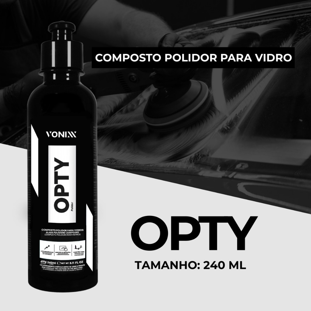 OPTY é um composto polidor de alta performance formulado exclusivamente para o polimento de vidros. O produto atua de forma eficaz na remoção de arranhões, riscos superficiais, riscos de palhetas e marcas d'água de vidros em geral. Tamanho: 240ML MODO DE USO: Agite bem o produto antes de usar. Antes de iniciar o procedimento, inspecione cuidadosamente o vidro. Caso haja algum tipo de avaria, como rachaduras, trincas ou batidas profundas de pedras, não realize o polimento. É de fundamental importância que o vidro esteja limpo e descontaminado com Prizm Vonixx. Aplique o produto diretamente na boina de feltro, carpete ou jeans. Realize movimentos cruzados e sobrepostos com uma politriz rotativa, mantendo a velocidade entre 1200 e 1600 RPM. Verifique a temperatura do vidro, mantendo-a entre 55º e 65º. Lubrifique a boina de polimento com um borrifador de água conforme necessário, evitando o contato direto com o vidro. OBSERVAÇÕES: Evite tocar no vidro durante o processo de polimento. Jamais pulverize água diretamente no vidro durante o polimento, pois esse procedimento pode causar rachaduras totais ou parciais no vidro. A inclinação da boina de polimento pode favorecer a formação de graus e marcas no vidro. Dependendo da profundidade dos arranhões, será necessário realizar etapas de lixamento. Ficha técnica