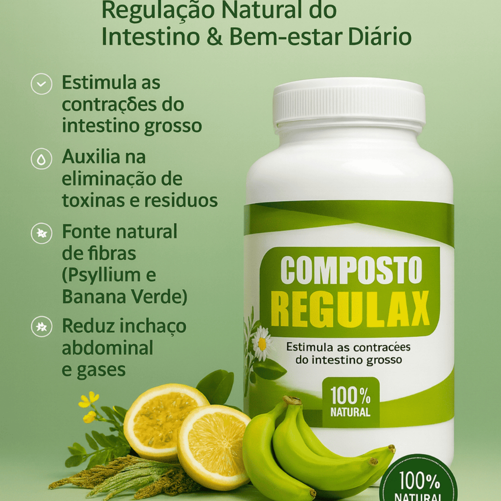O Composto Regulax Natuviva foi desenvolvido para quem busca regulação intestinal diária, eliminação natural de toxinas e sensação de leveza todos os dias. Sua fórmula combina Psyllium, Sene, Frângula, Banana Verde, Funcho, Maracujá e Cássia Sagrada, ingredientes reconhecidos por sua eficácia real na saúde intestinal. Benefícios comprovados do Composto Regulax Natuviva ✔ Estimula naturalmente as contrações do intestino grosso, facilitando o funcionamento diário ✔ Auxilia na eliminação de resíduos e toxinas acumuladas, promovendo conforto e leveza ✔ Fonte rica de fibras solúveis e insolúveis (Psyllium + Banana Verde) ✔ Reduz inchaço, gases e desconforto abdominal ✔ Melhora o trânsito intestinal sem causar cólicas intensas ✔ Favorece a saúde digestiva e o bem-estar geral Por que o Regulax é diferente? 🌿 Fórmula 100% natural 💚 Combinação de plantas medicinais usadas há décadas ⚖️ Equilíbrio e regularidade diária 💨 Sensação real de alívio e leveza Leveza, conforto e equilíbrio intestinal — todos os dias. 👉 Garanta agora o seu Regulax Natuviva e sinta a diferença no seu corpo já nos primeiros dias! regulax, laxante natural, regular intestino, psyllium, banana verde cápsulas, reduzir gases, desinchar barriga, intestino preso, composto natural, suplemento digestivo, natuviva, saúde intestinal, suplemento natural, laxante leve