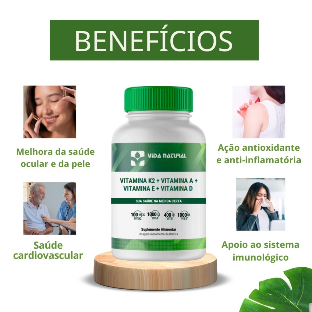 COMPOSTO VITAMINA K2 100MCG+ VITAMINA A 1000UI+ VITAMINA E 400UI+ VITAMINA D 1000UI 30cáps 60cáps Fortaleça sua saúde com um composto exclusivo que une as vitaminas K2 (100 mcg), A (1000 UI), E (400 UI) e D (1000 UI) – nutrientes essenciais para o bom funcionamento do organismo, com foco na saúde dos ossos, imunidade e proteção cardiovascular. Essa combinação sinérgica potencializa os efeitos de cada vitamina, promovendo uma atuação mais eficaz no metabolismo do cálcio, na regeneração celular e na defesa do corpo. Validade: 9 meses Posologia: Tomar 1cp ao dia ou uso conforme orientação médica Indicado para uso diário conforme orientação de profissional de saúde. Este suplemento não substitui uma alimentação equilibrada nem medicamentos. Consulte seu médico ou nutricionista antes de iniciar o uso. Imagens meramente ilustrativas