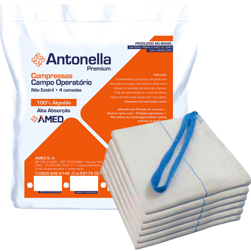 Compressa Campo Operatório Antonella são confeccionados em tecido quadruplo 100% algodão, macios e altamente absorvente com fio radiopaco. Os campos operatórios com fio radiopaco facilita a visibilidade no local da cirurgia, pois é o único meio que o raio-x tem para detectar uma compressa quando imersa em sangue. A compressa têm um cadarço duplo em forma de alça na extremidade, que deve ser deixado do lado externo da cavidade cirúrgica. Indicado para procedimentos cirúrgicos, em geral para absorção de sangue, secreções e ainda anteparo traumático de vísceras e tecidos. Oferece alta absorção. ESPECIFICAÇÃO TÉCNICA: Nome: Compressas Campo Operatório Com fio Radiopaco Tamanho: 23 centímetros x 25 centímetros Marca: América Modelo: Antonella Premium / Valentina Premium Produto Original: SIM Quantidade: 50 unidades SOBRE O ENVIO DO SEU PEDIDO: Prazo para postagem: Em até 24h Produto a Pronta Entrega: Sim Produto com Nota Fiscal: Sim